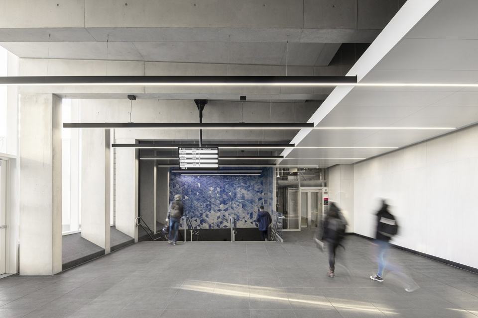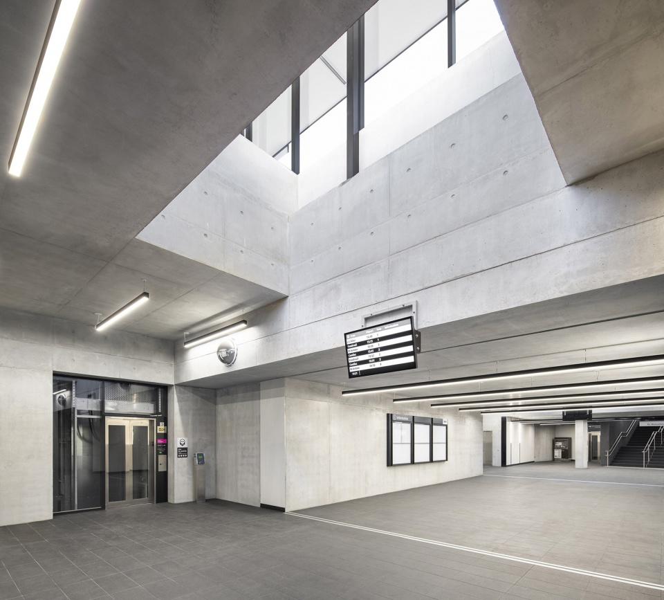 The volume of the building creates an opening at the junction with the existing metro tunnel, allowing it to be attached perpendicularly, with a view to structural and functional optimization. Upon approaching the station, a signal canopy welcomes users and identifies the two entrances to the building, one dedicated to the metro and one allowing direct access to the underground corridor leading to the EXO station and to MUHC.