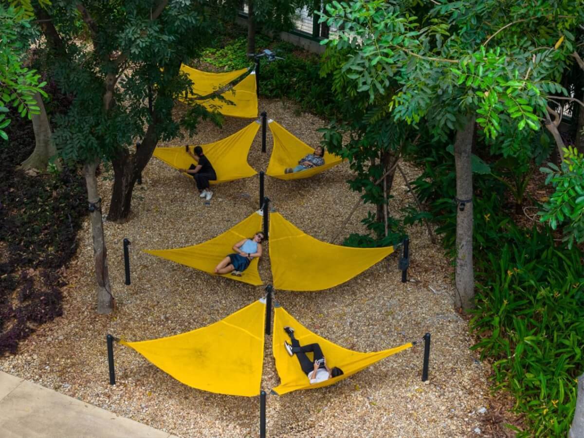 自然公园设有步行、放松和锻炼的环路。植根于当地文化的定制吊床被战略性地放置在环路沿线。作为过渡,静修空间包括一个看台,为非正式聚会和会议提供了适当的空间。锦鲤鱼塘是这个空间的核心特征,营造了一个宁静的环境,增强了整体氛围。遮阳棚下的阴凉区域为放松和社交提供了凉爽舒适的场所。最后,对角线公共空间将底层到达广场与屋顶连接起来。值得一提的是,到达广场配备了可移动的长椅和花盆。这是经过深思熟虑的设计,以适应各种需求,为休闲互动和更有条理的活动创造了一个多功能的空间。屋顶区域提供活动空间、可食用的社区花园和下班后的日落甲板。