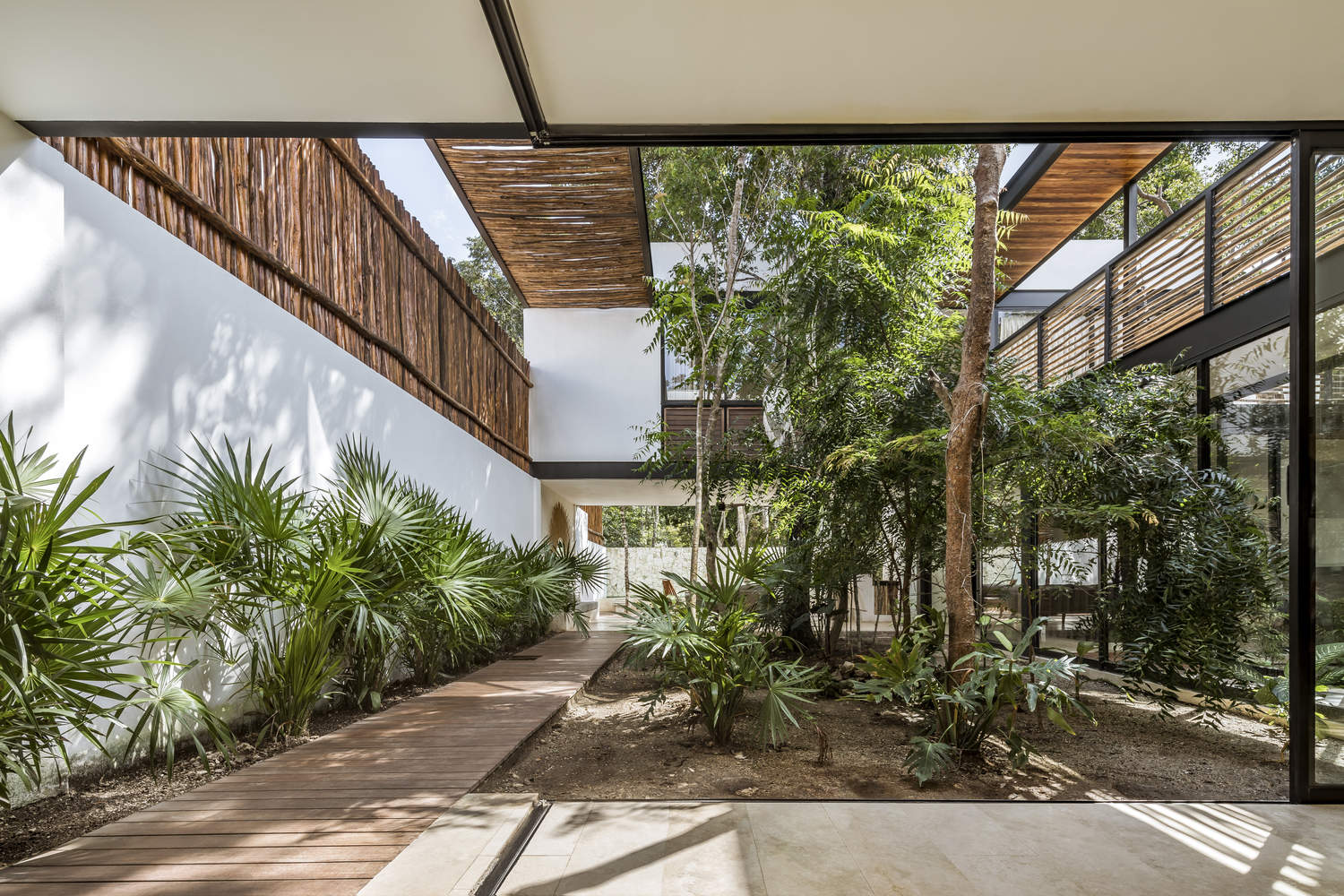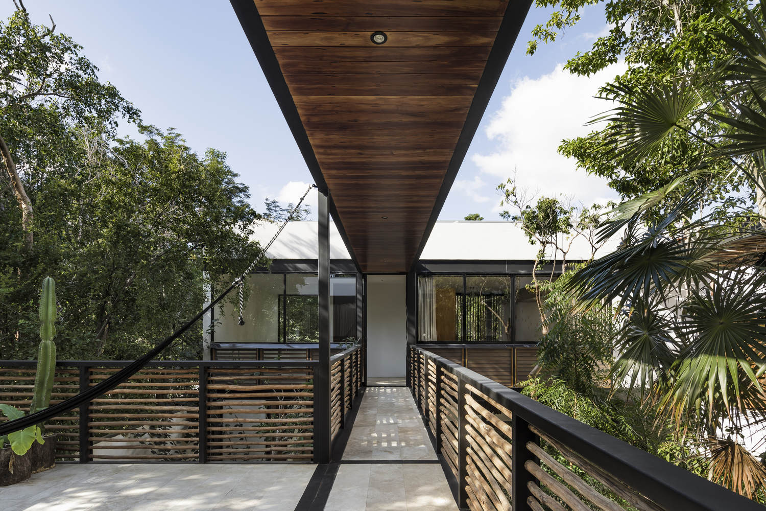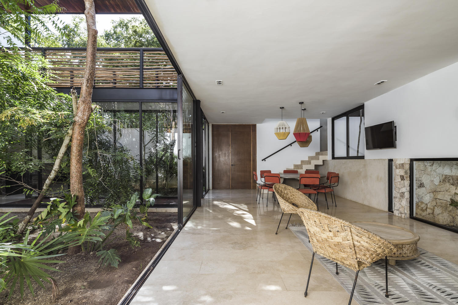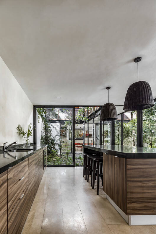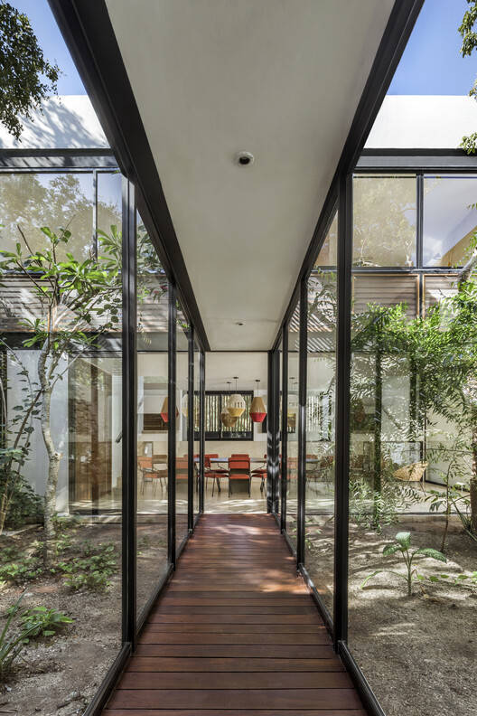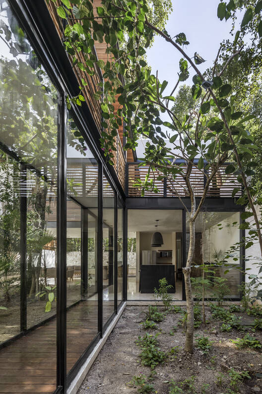 Formally, the project is conceived as two volumes floating above the lateral boundary walls; these bodies correspond to the bedrooms that embrace a group of significant trees and form the patios that connect the public spaces. These elevated volumes allow the social area on the ground floor to have clear views of the existing vegetation. On the upper floor, the volumes of the bedrooms are connected by an exterior corridor, which creates a path in contact with the existing vegetation.