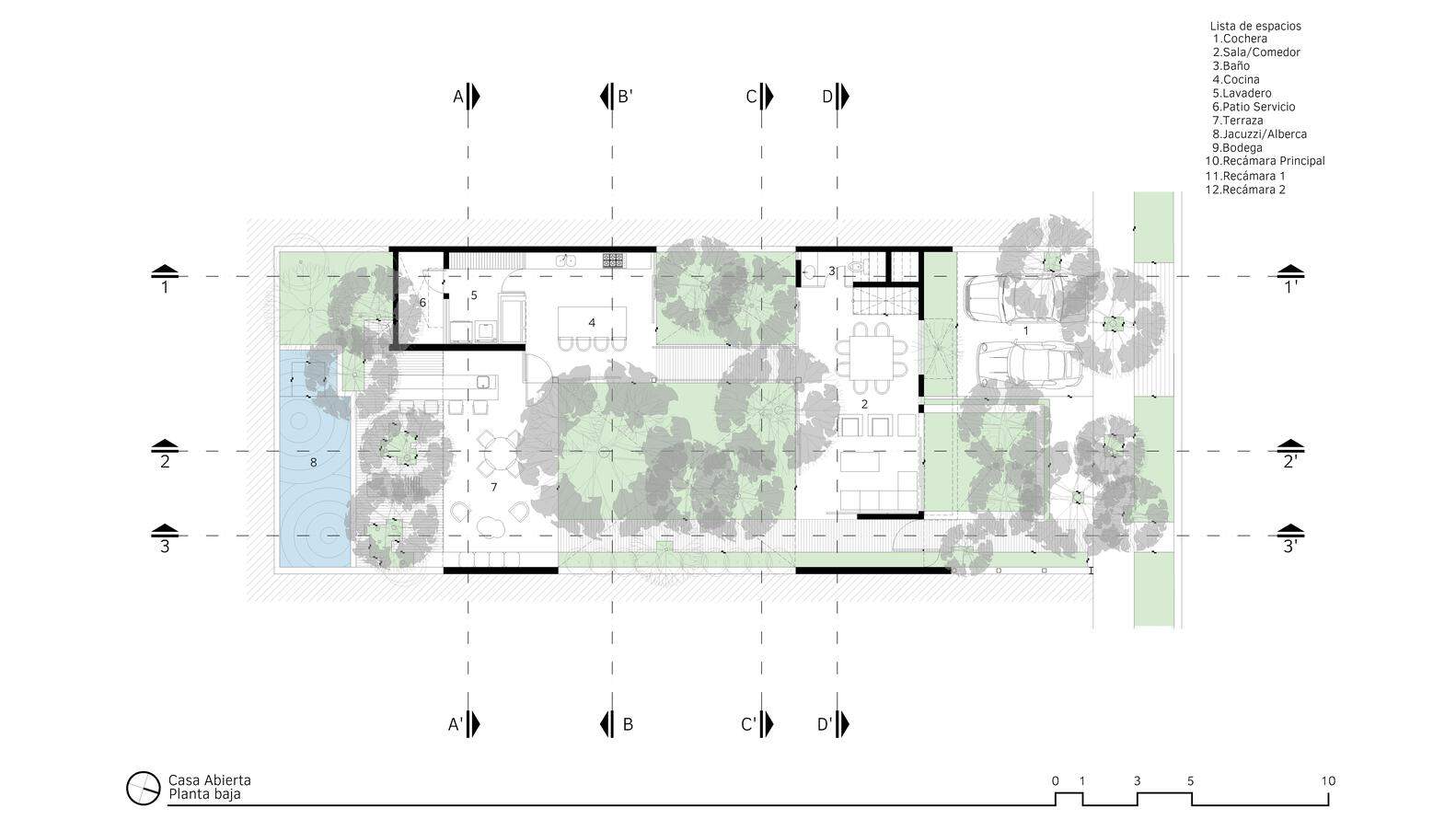 The location of the program components responds to the conservation of the pre-existing vegetation, utilizing areas with less vegetation to develop the covered spaces and forming various patios around groups of significant trees as an articulating element.