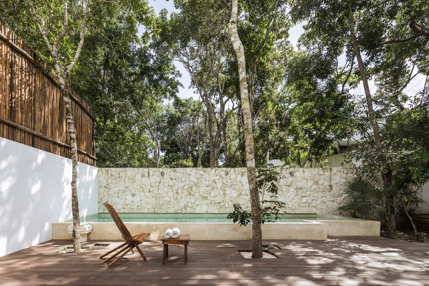 此外,对于饰面,使用了该地区的材料,如木材、巴加雷克(一种传统建筑材料)和手工放置的石头,这与在该地区丛林中呈现现代外观的钢结构形成了鲜明对比。混凝土灰泥也被使用,与来自chukum树的树脂相结合,不仅具有防水性能,而且与现场已有的元素实现了更大的和谐,并为项目自然地提供了温暖的色彩。