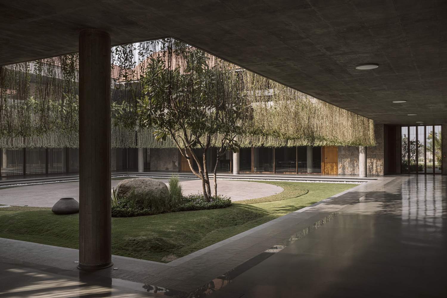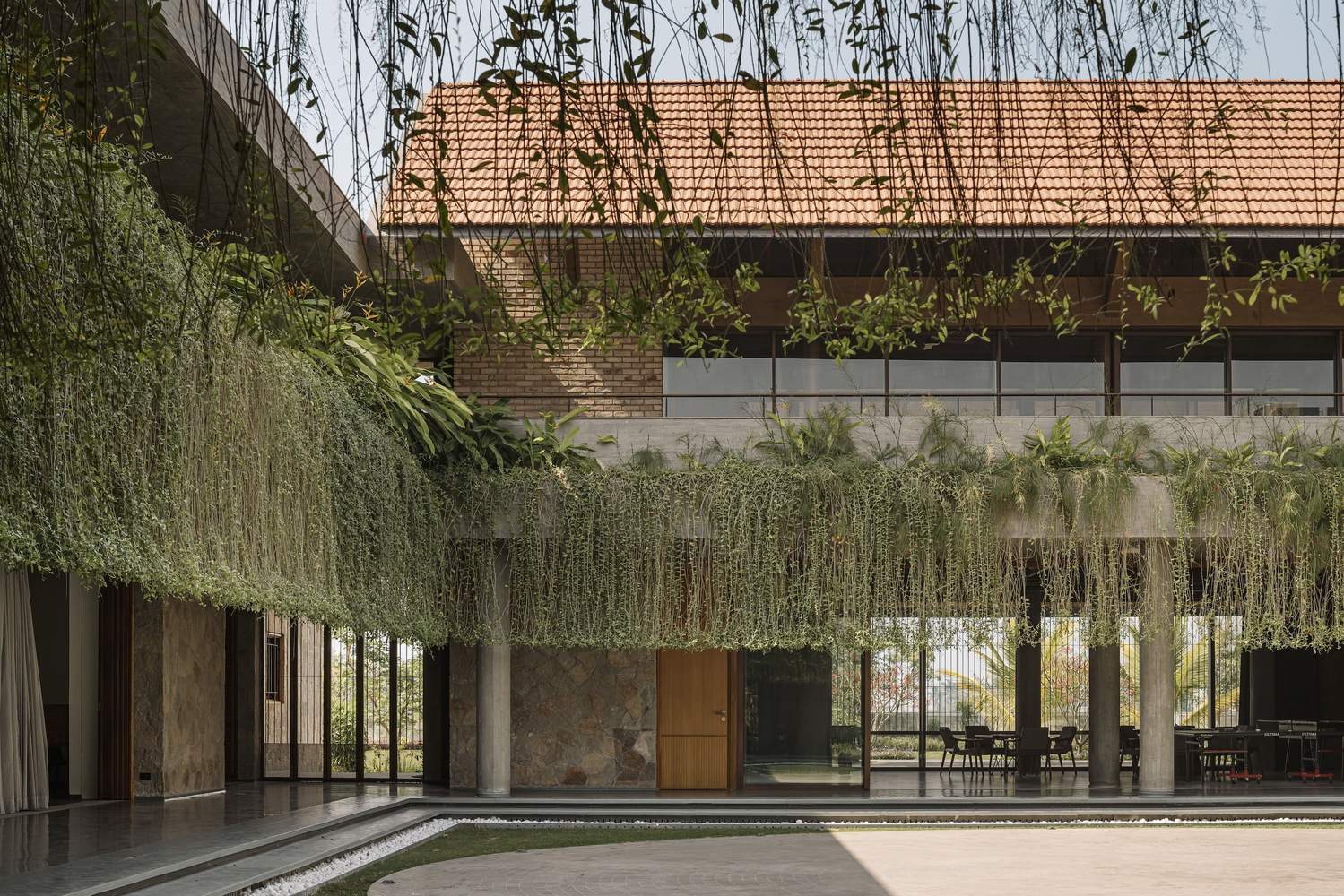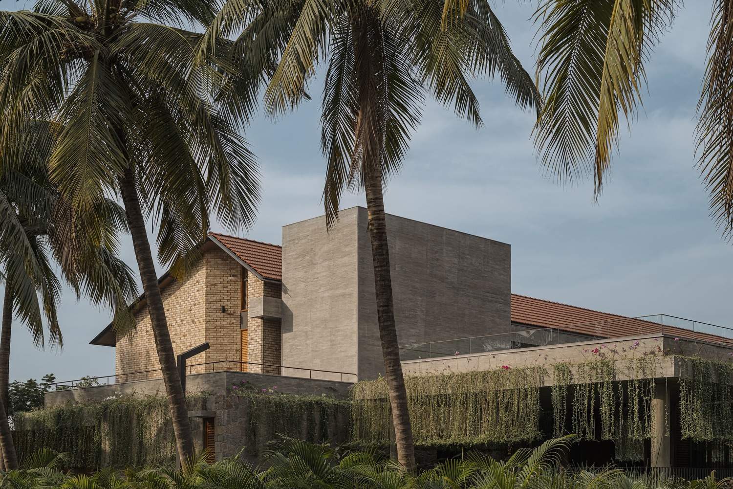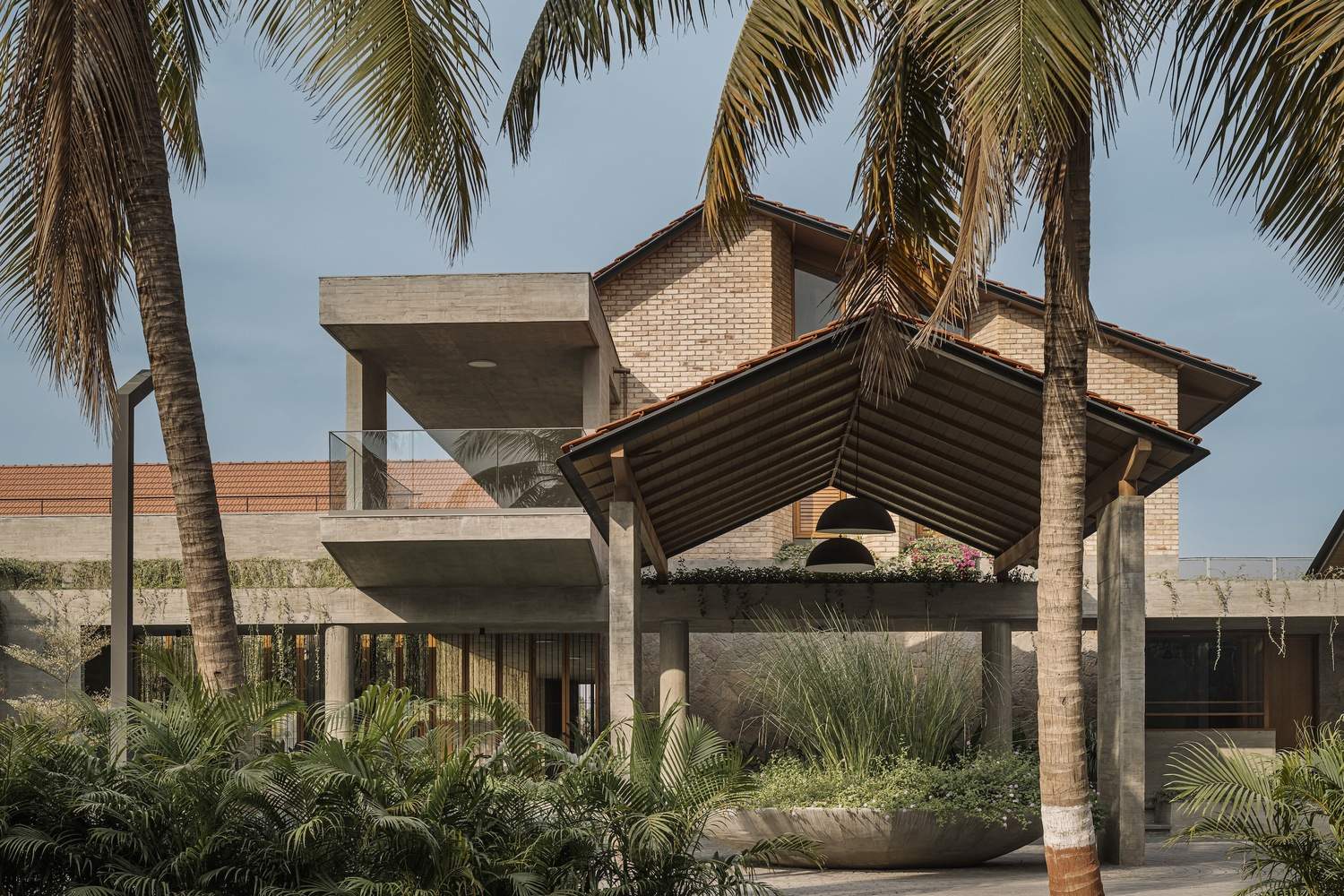 The landscape has been consciously designed with species viz. gulmohar, neem, banyan, coconut tree, tabebuia rosea, all that connect to the tropical context profoundly echoing with our roots. The open area is further peppered with red agra stone pathways, irregularly cut and strewn over the grass.The overall design and the material palette have a timeless eminence that can withstand changing architectural trends, often improving in appearance over time as it ages gracefully and gains character.