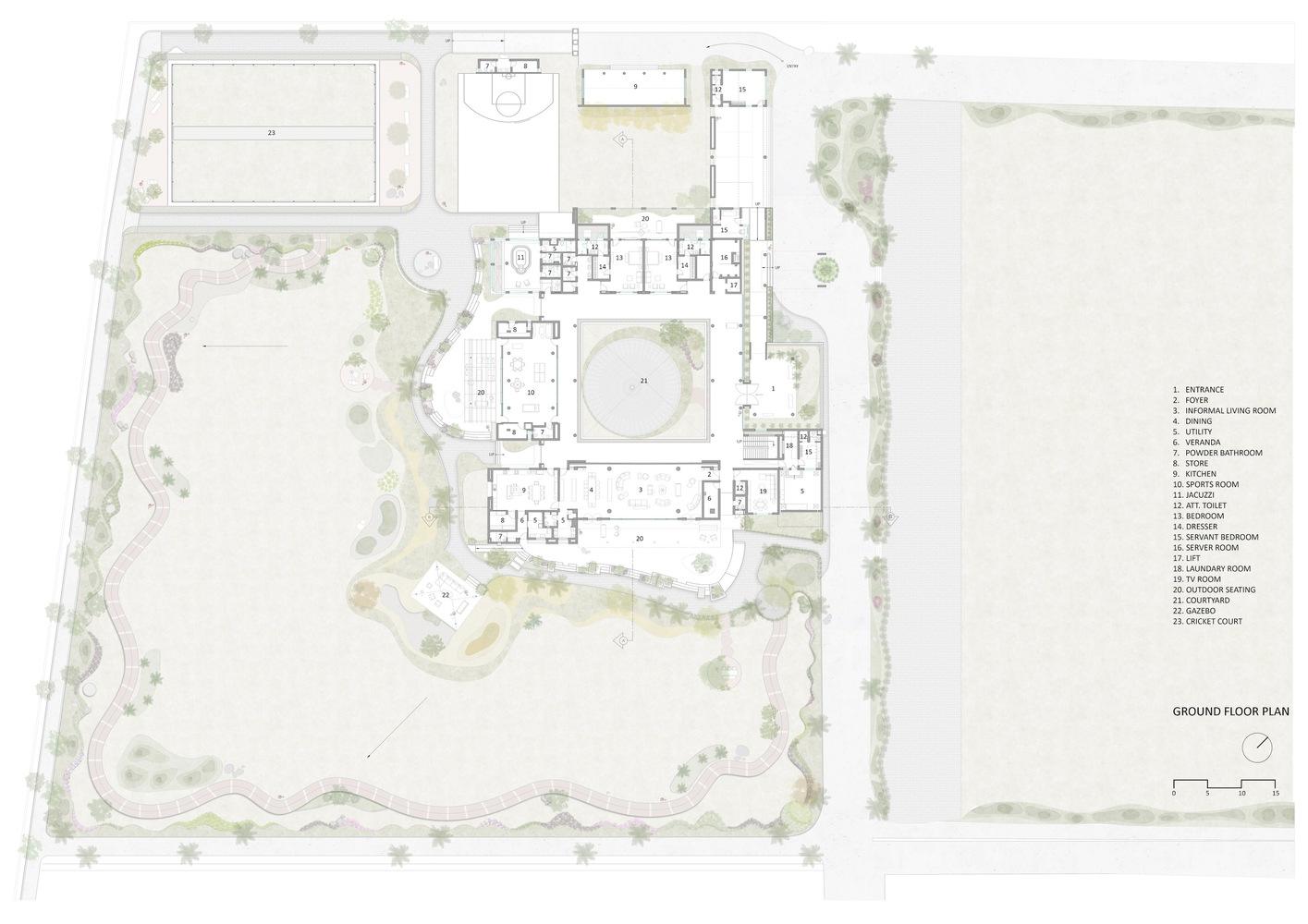 景观是有意识地用物种设计的,即gulmohar、印楝、榕树、椰子树、tabebuia rosea,所有这些都与热带环境紧密相连,与我们的根相呼应。开阔地带还点缀着红色的阿格拉石径,不规则地切割并散布在草地上。整体设计和材料选择具有永恒的卓越性,能够承受不断变化的建筑趋势,随着时间的推移,外观往往会随着优雅的老化和个性的增强而改善。