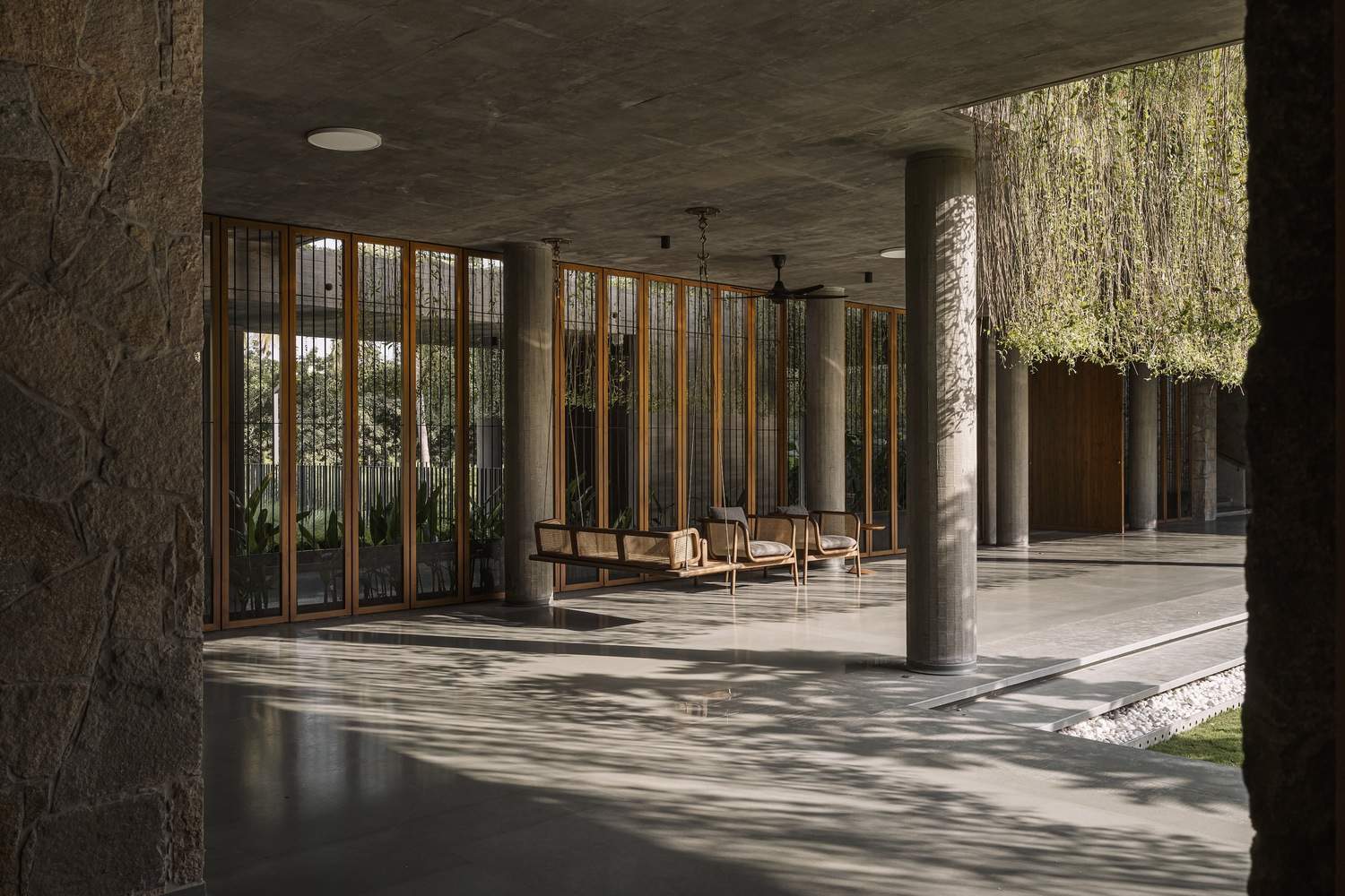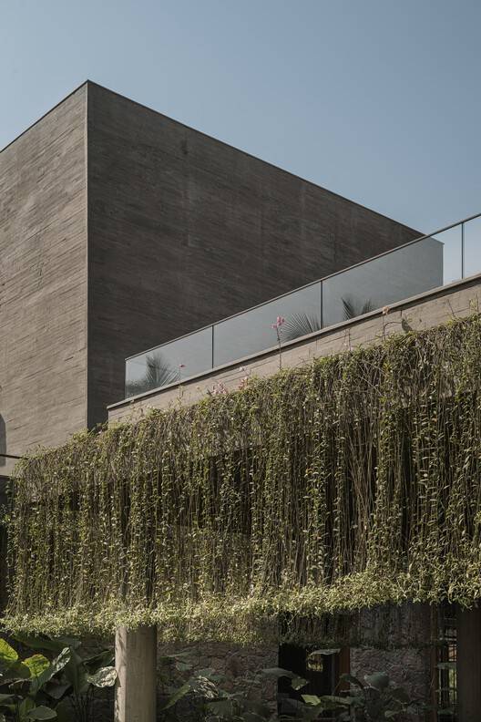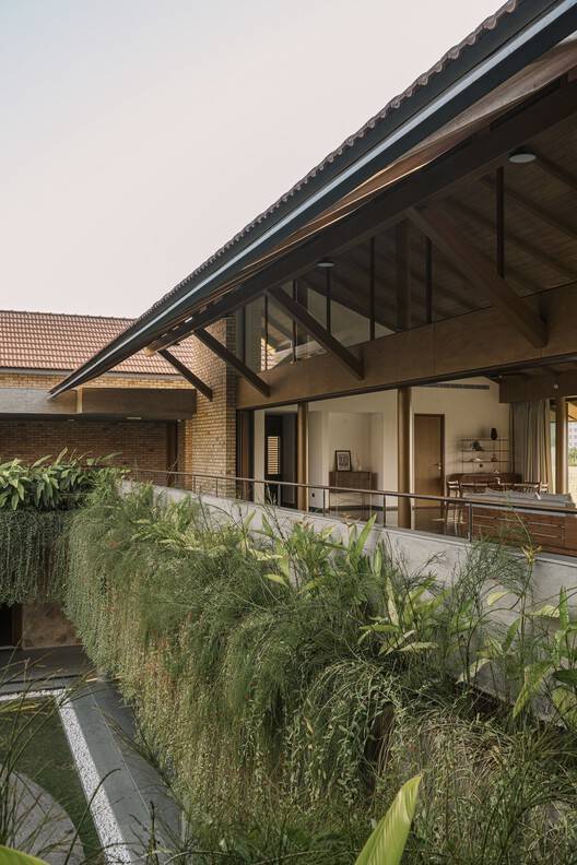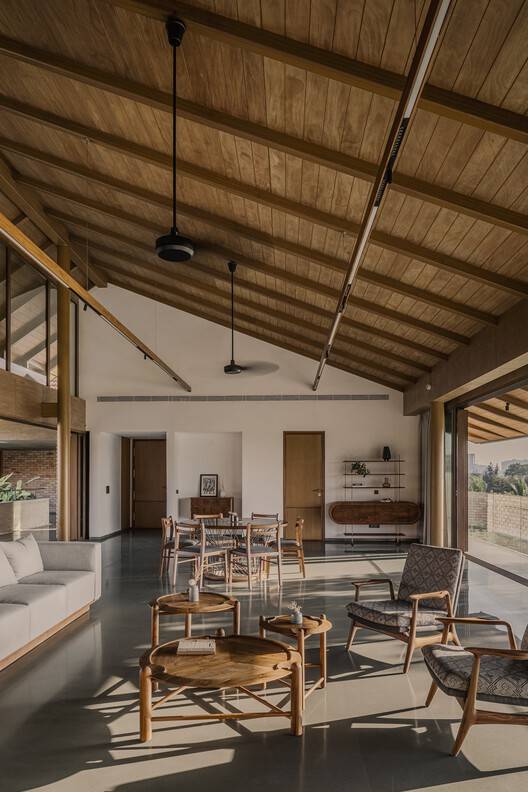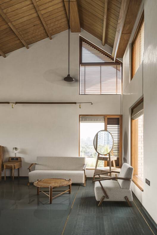 宽敞通风的房间配有最少的家具,为居民提供了诗意的自由,让他们在不牺牲现代舒适性的情况下,拥有谦逊质朴的简单感。每个门槛都经过精心设计,使其在任何天气下都能令人愉快。客厅和运动室里的木制格子架挡住了西南的阳光,同时见证了一整天不同的社会形态,典型的印度秋千成为了中心舞台。