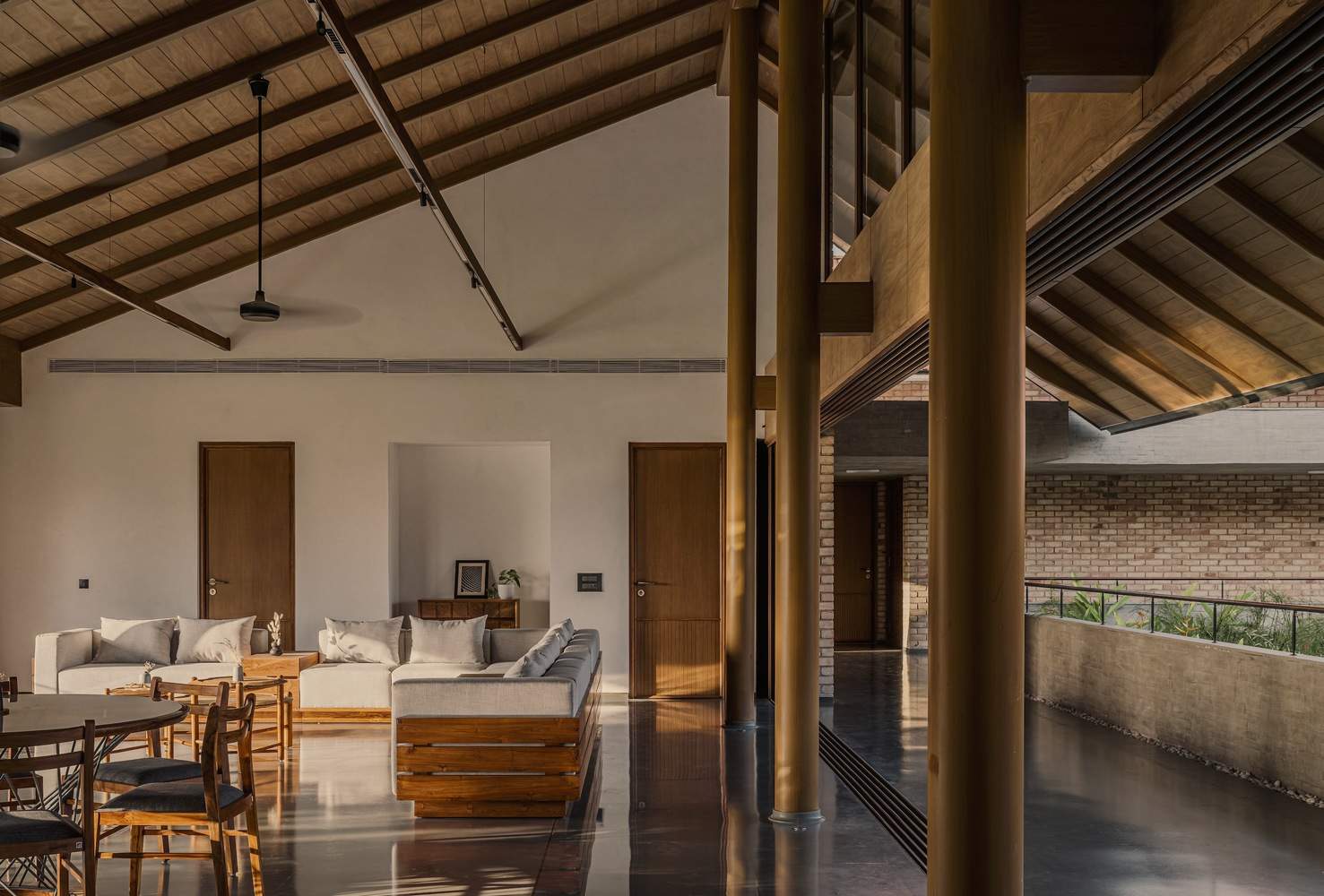 The first floor majorly accommodates bedrooms and informal areas, all dedicated to the family's personal space. The elevation, here, embraces exposed brickwork for all outward walls giving it depth and character. The cavity walls make room for the deep-seated windows to work as a seamless shading device. In between the two floors, lies a band of exposed concrete adding a layer of visual interest influencing the perceived scale. The steel framing for the roof with Mangalore tiles above completes the composition. The underside of the roof has been cladded with plywood panels to provide warmth to the interiors and contrast with pale lime-plastered walls in the interiors. Flooring is decked with kota stone laid in diverse patterns in different areas to simulate a definition of the space. The living area has a terrazzo pattern made out of kota stone strips such that it forms its own carpet-like look. The interiors have a muted palette of teak and white oak wood, lime-plastered walls, and kota flooring with a hint of brass, all creating a cohesive ether.