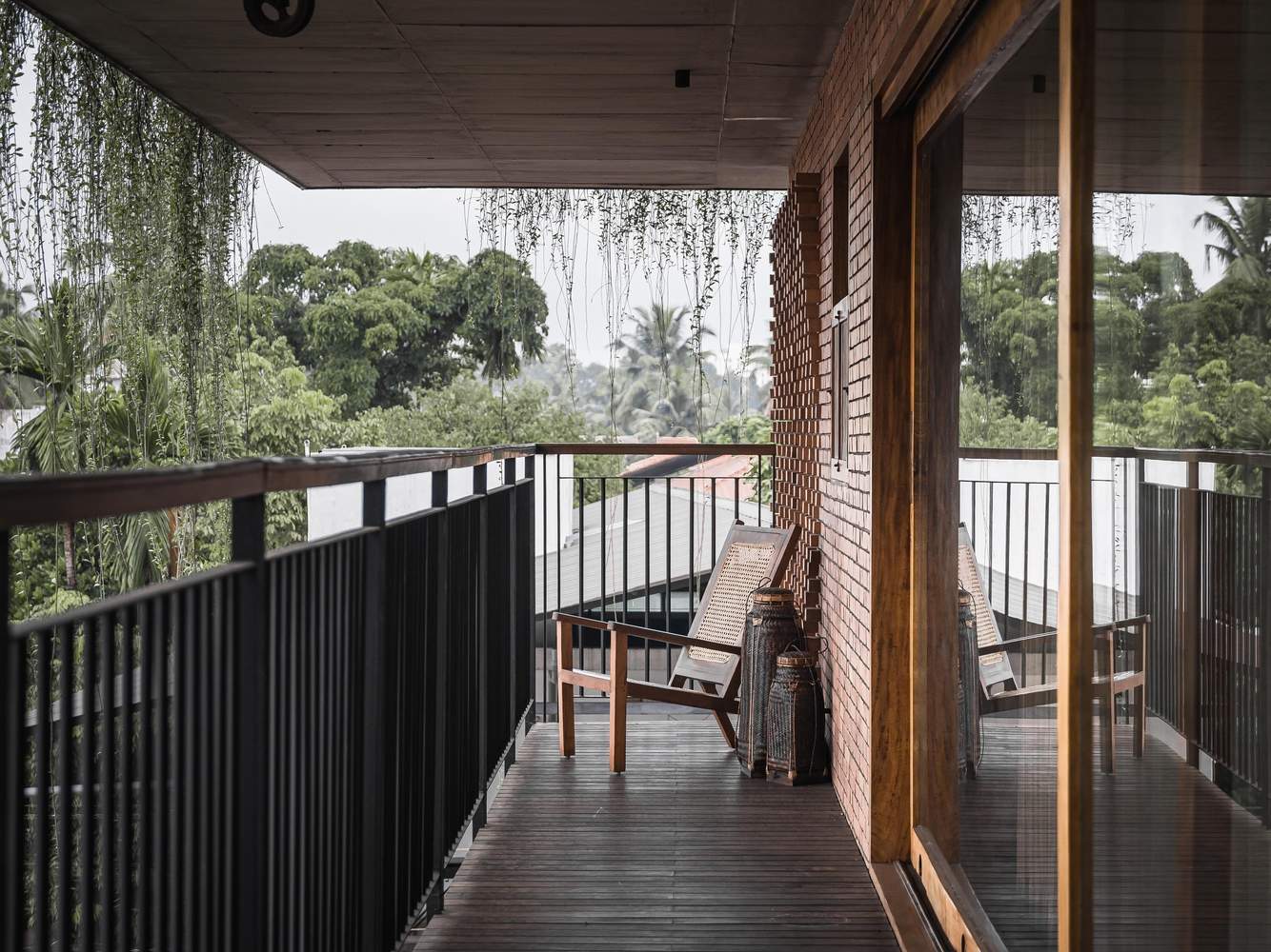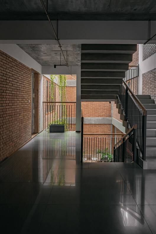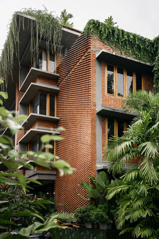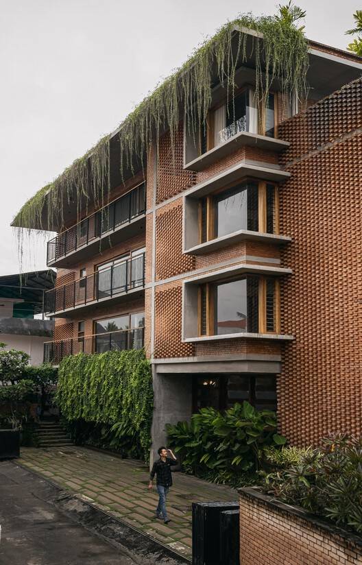 所使用的建筑方法展示了对工艺的强烈奉献,正如每块砖的细致和精确放置所示。居住区通过覆盖阳台和庭院的大型屋顶悬挑向外扩展,将自然带入建筑内部。级联植被的添加在自然和建筑环境之间保持了和谐的平衡,同时软化了建筑的严酷边缘。此外,与自然有强烈联系的公共区域,如室外庭院和走廊,有助于居民感受到社区的感觉。刻意使用空气、光线和植被,通过创造一个与周围环境既和平又和谐的环境,改善了整体的空间体验。