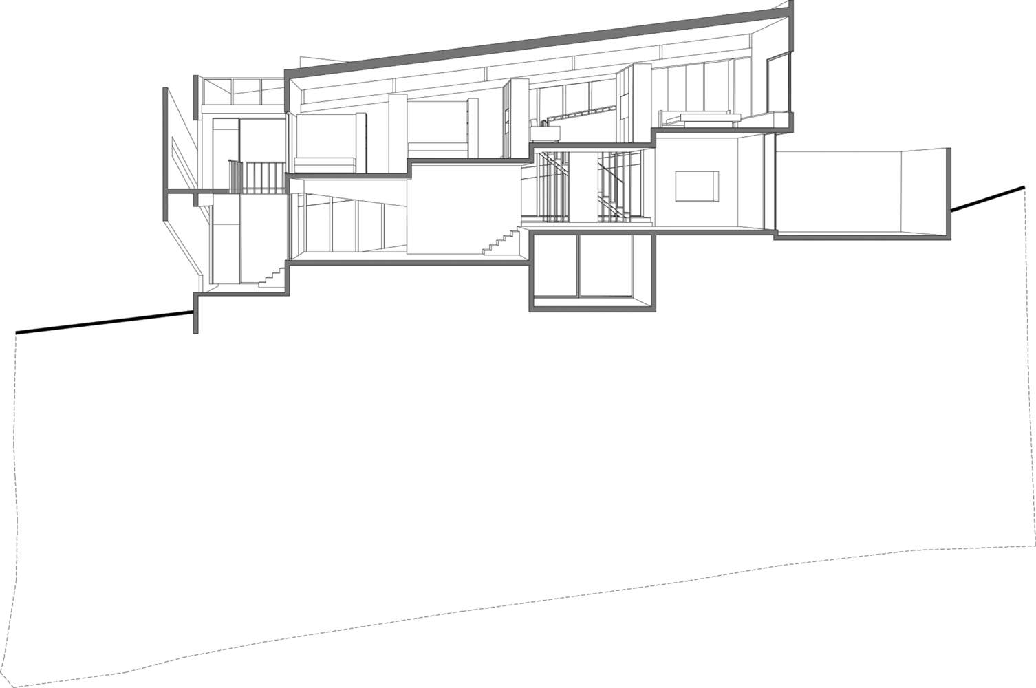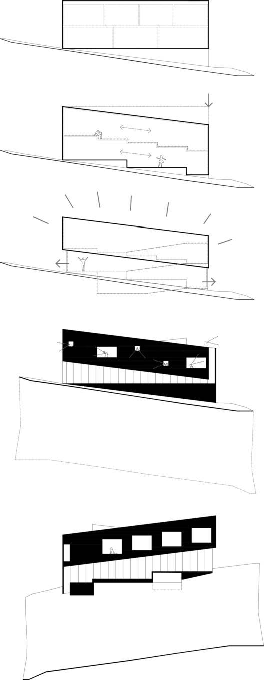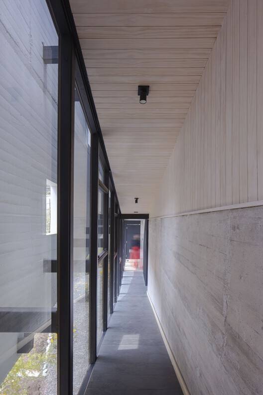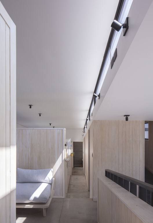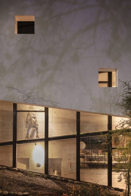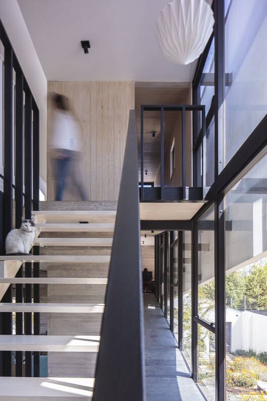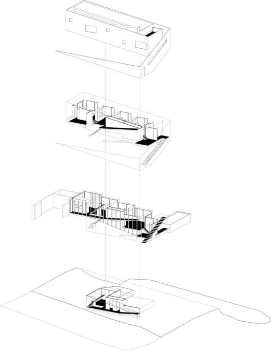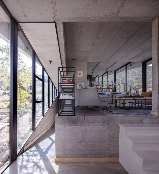 建筑师提供的文字描述Text description provided by the architects. The Sloping House owes its name to the dual condition of assuming the slope of the pre-Andean range of Santiago and self-acquired family debt, which confronts us with the revisionism of our own way of living, inhabiting, and projecting. As the first decision in starting this family project, we took on the slope and inhabited the continuous space, embodying in this domestic space a conscious search experienced in almost 20 years of professional practice, which set a roadmap for the project: the house had to be traversed, it had to allow for communal and individual life, the social, work, and contemplation, the functional and the aesthetic. As a foundational act, we traced the spaces with chalk on the ground and captured with a device the views that each one wanted to frame (see photos by authors).