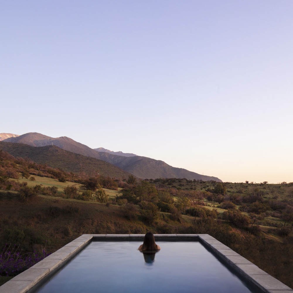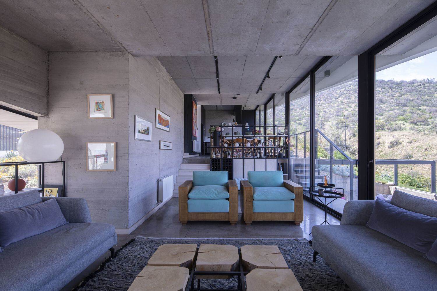 The pavements of refined concrete slabs and the exposed concrete walls form an austere interior atmosphere devoid of other finishing elements, which only appear as punctual applications within the interior journey. This material austerity is also carried into the interior of the bathrooms, which are worked as monochromatic spaces with glass mosaic on walls and floors. The stairs and ramps, as elements of the natural connection between the two superimposed naves, generate new relationships between them and propose different speeds of movement. The staircase for faster walking connects the spaces directly, while the ramp allows for a slow ascent against the slope and a gradual discovery of each room or the surrounding landscape.