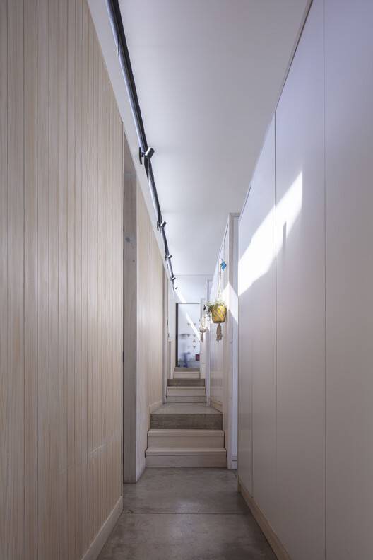同样质疑居住方式的是,该项目是在两个交错、连续和重叠的空间/容器中开发的。较低的一个,在整个周边向景观开放,在大厅、客厅和餐厅/厨房的连续中堂中包含社交空间。上层更为内向,包含办公室、卧室和家庭活动室的私密空间。这两个空间/容器都打破并改变了城市住房的空间连续性范式,除了浴室外,不考虑房间之间的划分。较低的体积呈现了一个连续的空间,有三个台阶,每个台阶有六个台阶,这些台阶成为社会区域之间的过渡阈值。上部空间也复制了连续空间的概念,但具有更亲密的特征,不同空间之间有五个台阶,只有三个台阶,由内置家具隔开,这些家具没有到达上部倾斜的天花板,并设法配置了亲密和私人的空间。