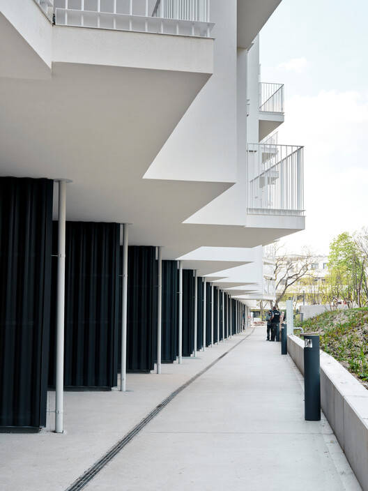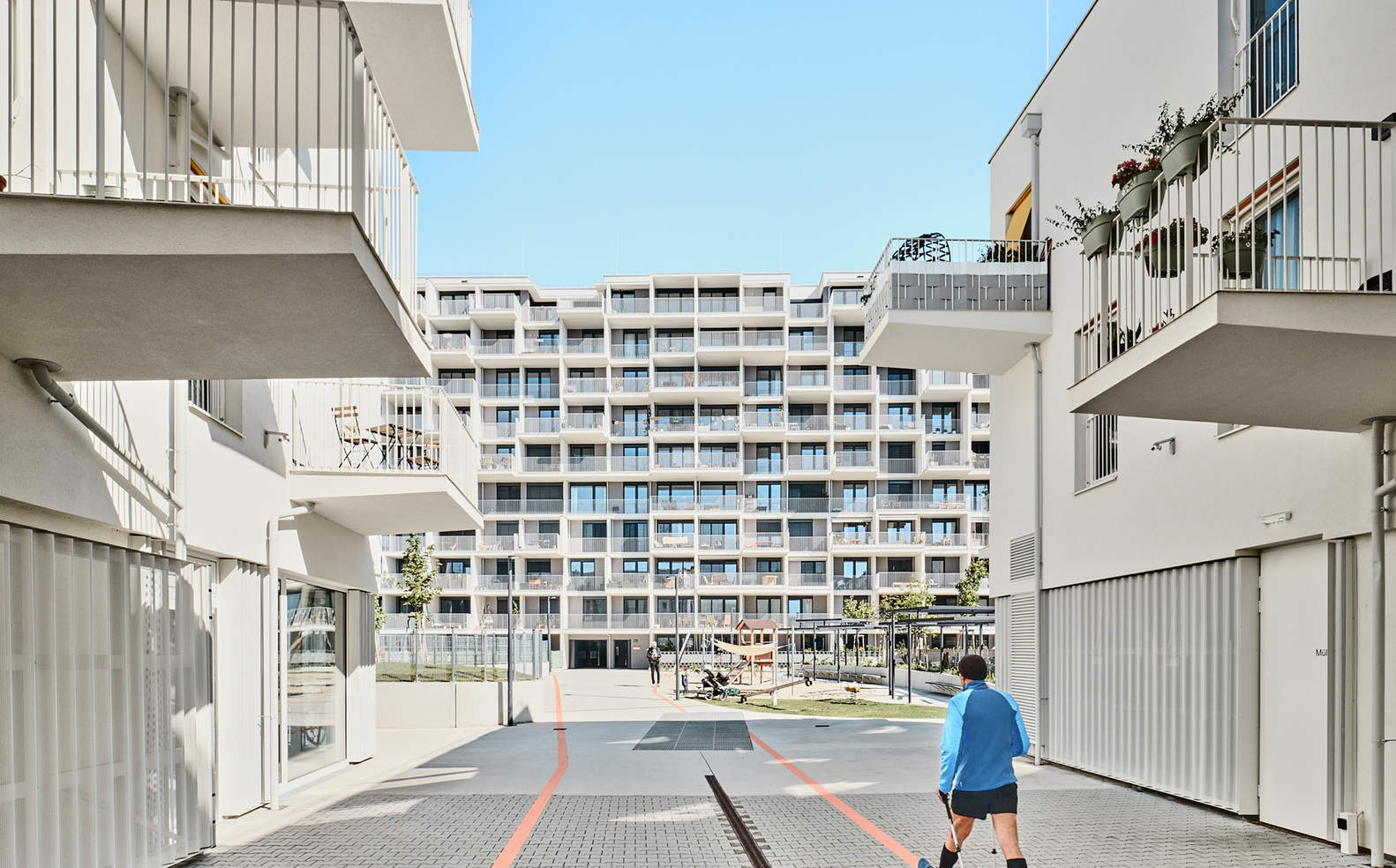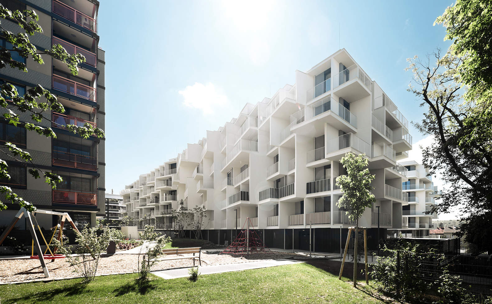 ZickZack - The direct neighbor of Say Hello! with all-around, zigzag-shaped balcony panels and movable, large-scale screen elements that alter the external appearance of the building depending on the position of the screens. The screens not only serve as variable privacy and glare protection but also allow the interior of the apartment to grow outward – creating an intimate, tent-like interior space on the balcony. Serious - The western entrance building is organized on split levels with mostly floor-through apartments, some of which also have several levels. Its facades are characterized by generous loggias that can be closed off to form conservatories.