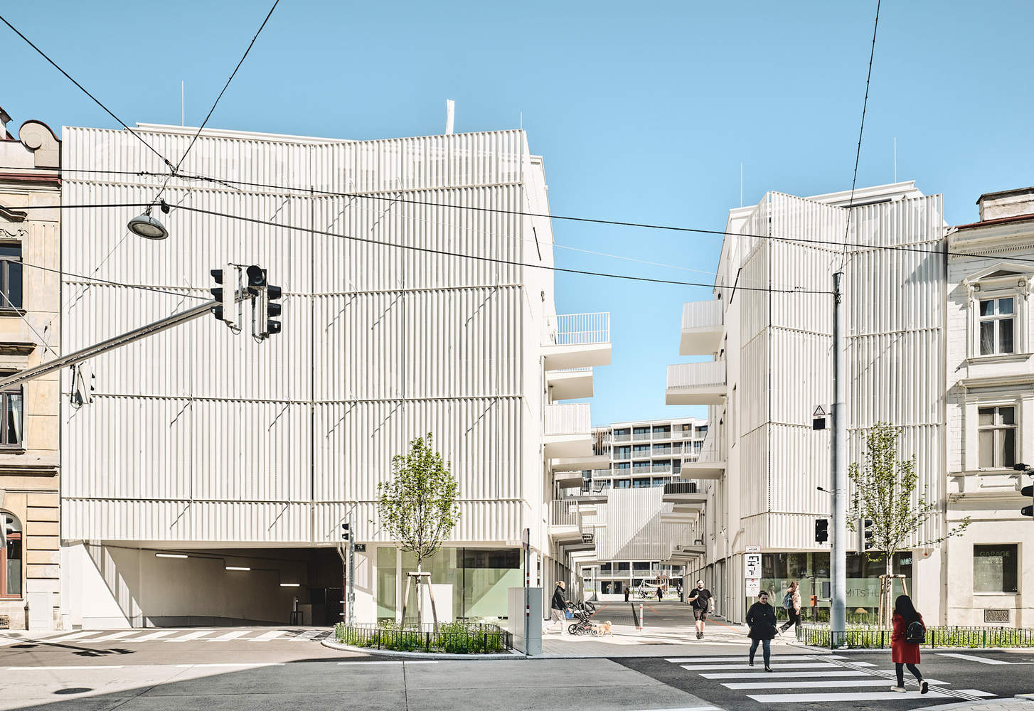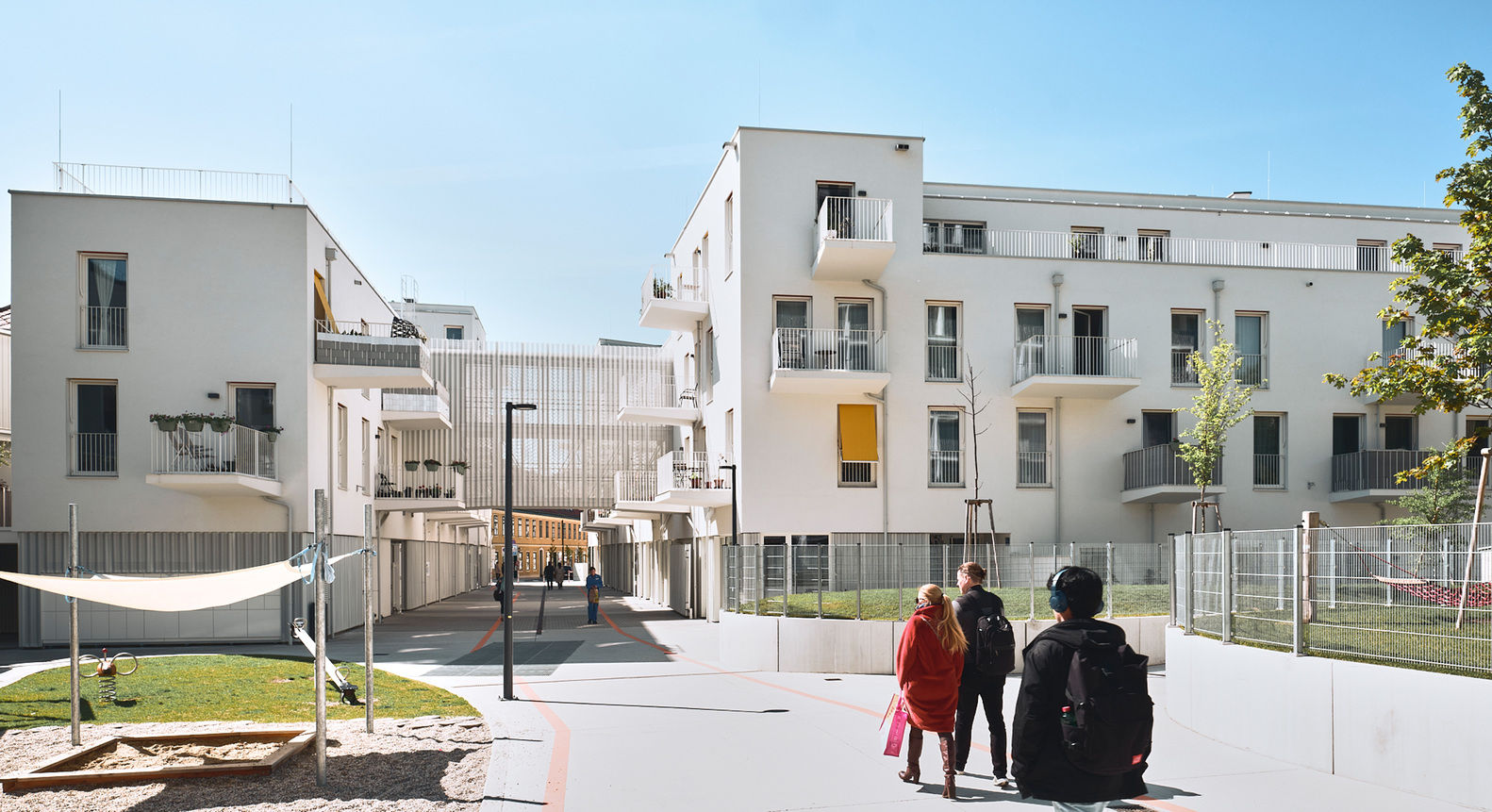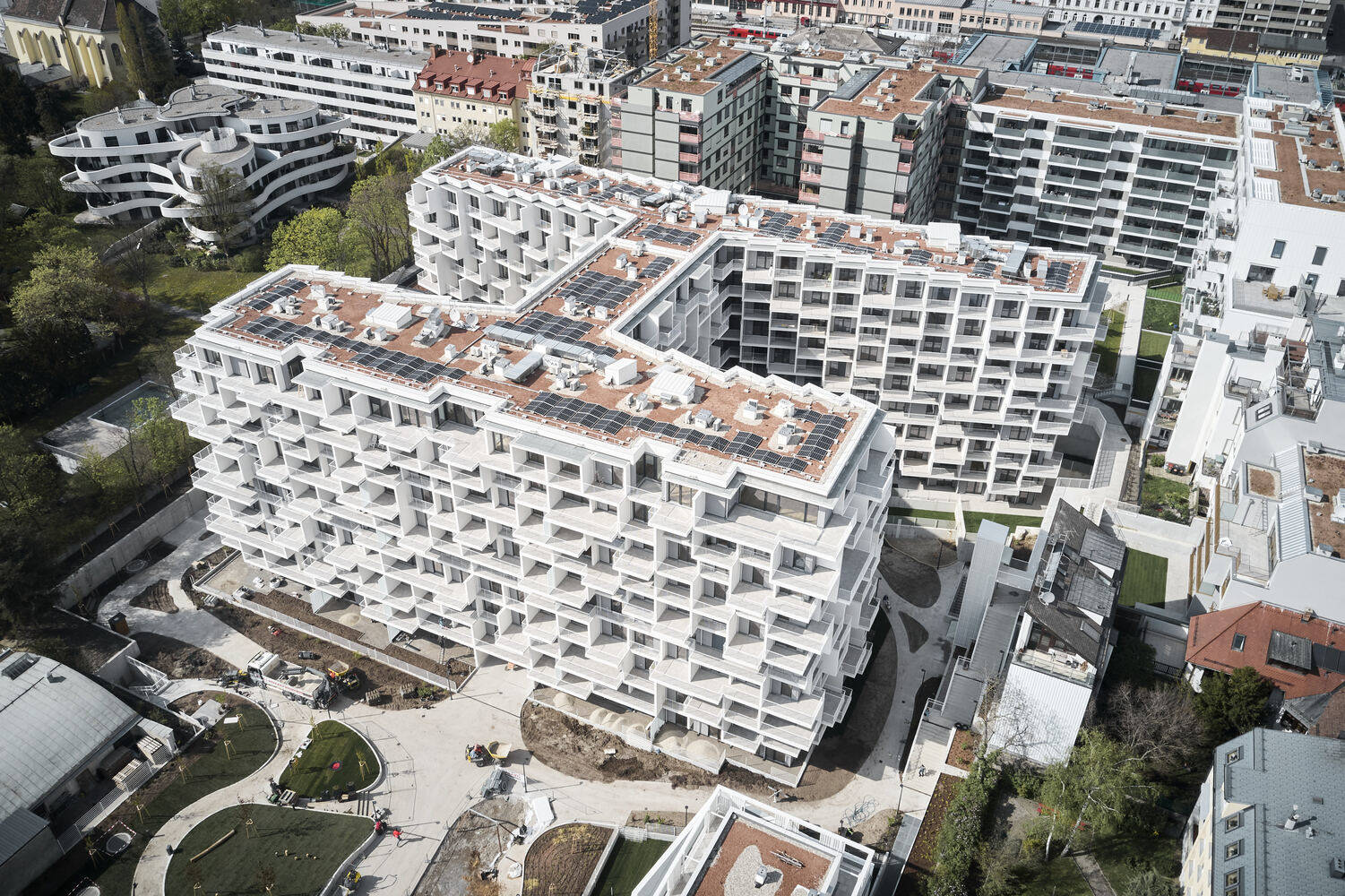 ZickZack - The direct neighbor of Say Hello! with all-around, zigzag-shaped balcony panels and movable, large-scale screen elements that alter the external appearance of the building depending on the position of the screens. The screens not only serve as variable privacy and glare protection but also allow the interior of the apartment to grow outward – creating an intimate, tent-like interior space on the balcony. Serious - The western entrance building is organized on split levels with mostly floor-through apartments, some of which also have several levels. Its facades are characterized by generous loggias that can be closed off to form conservatories.