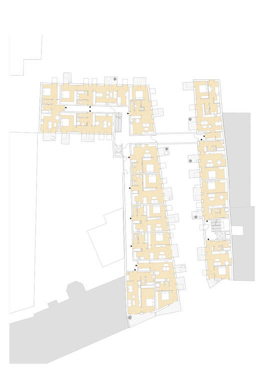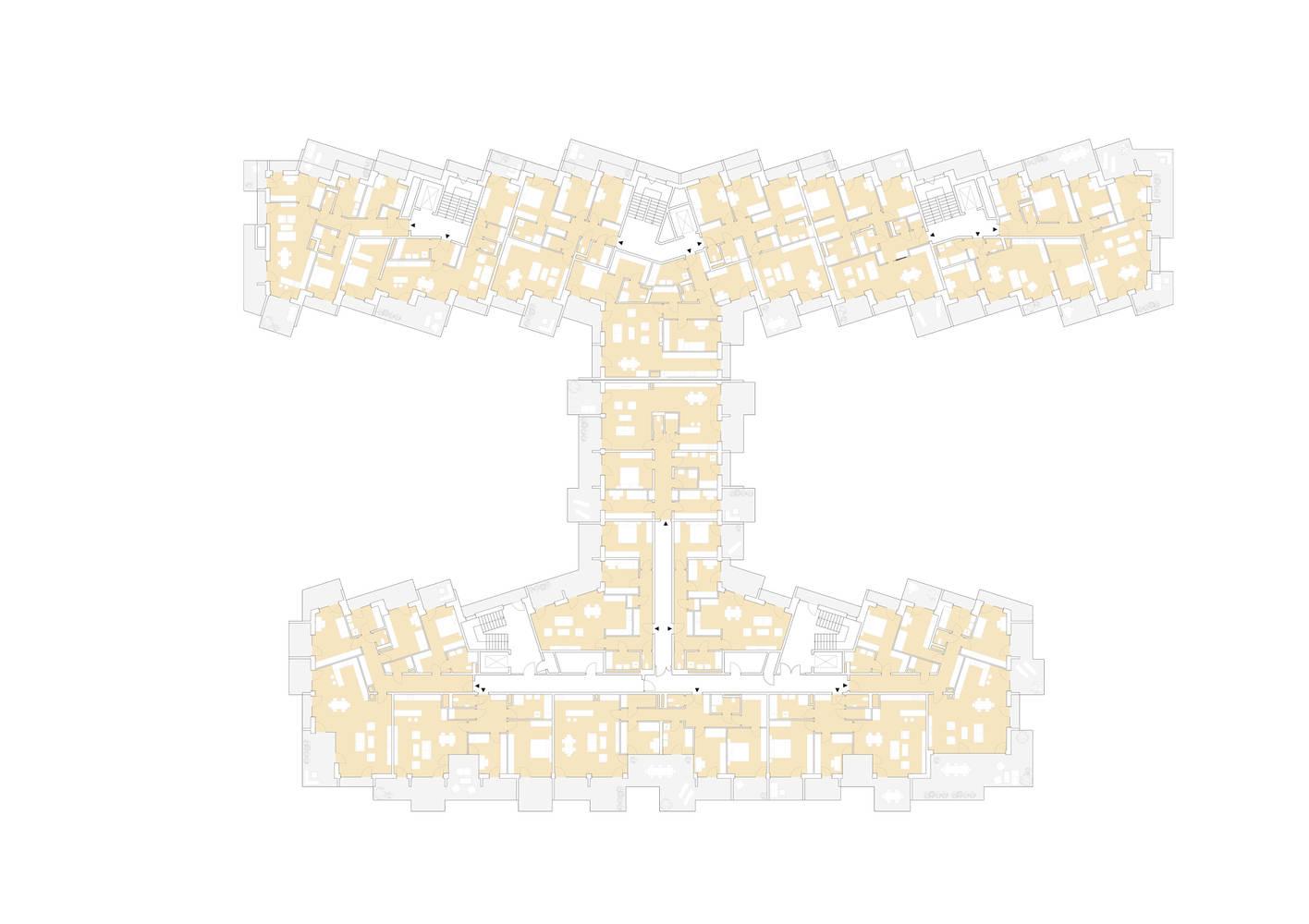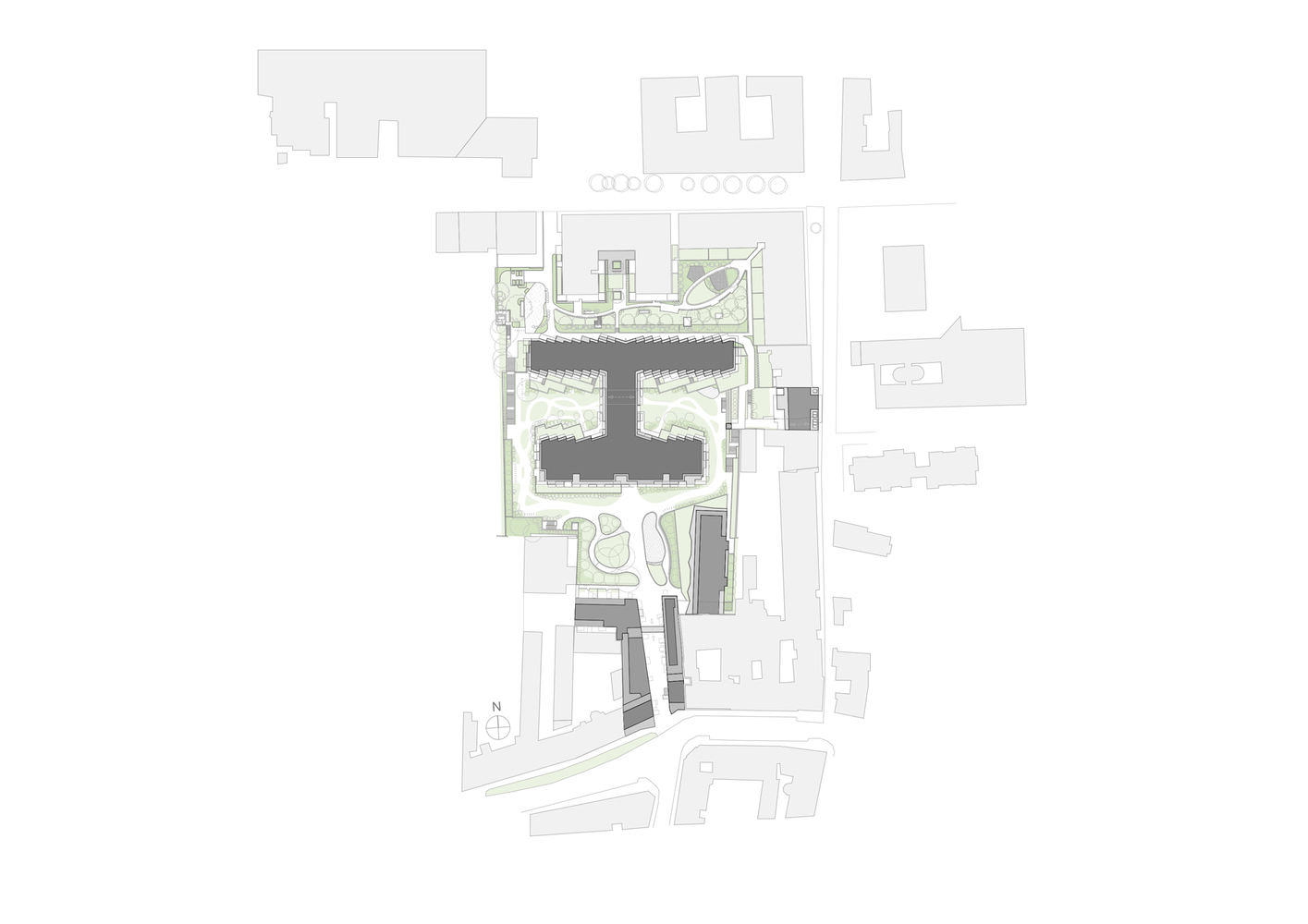 户外空间无障碍概念——现场(拱廊、游乐场、城市园艺等)以及附近(当地供应商、地铁、学校)的各个焦点通过路径网络连接起来。这些焦点不仅是节点,也是邻里互动的活动中心。北部和南部楼层之间的差异在两点上得到了克服:在东部,通过一个带电梯的楼梯,沿着室外空间设计的露台。西侧的通道仍需设计(邻里问题)。重要的是,建筑工地上的所有目的地都可以通过不同的路径到达。