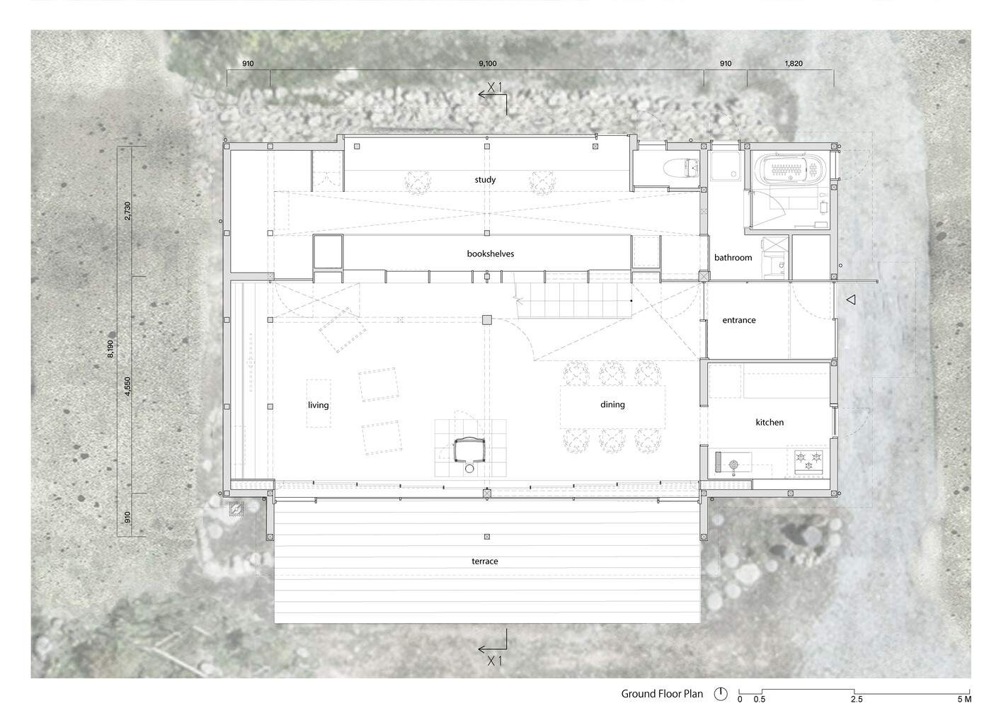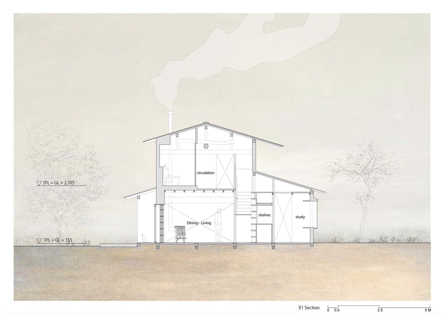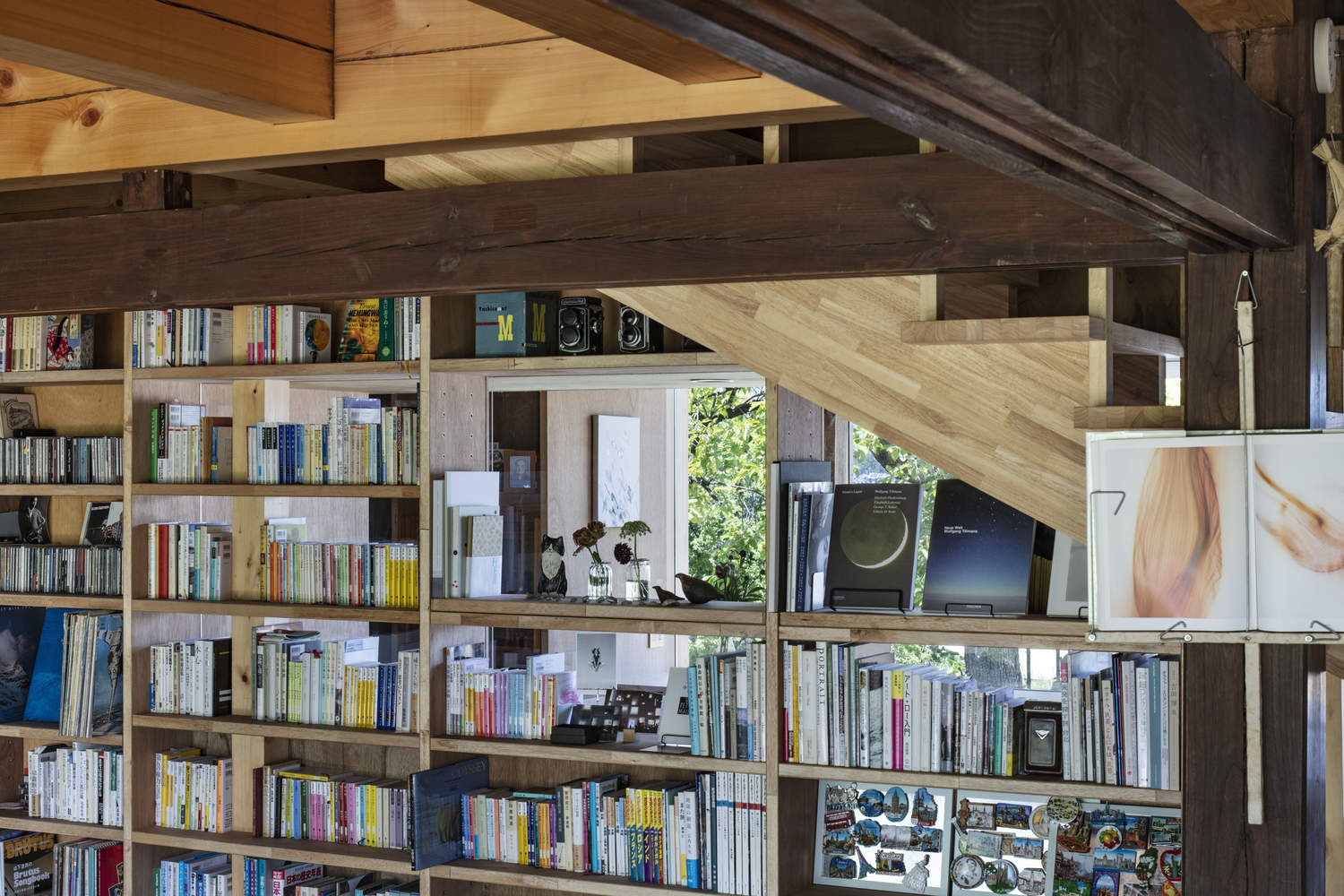 The house turns around a central wall where shelves and stairs are placed. That central focal point is not only of structural importance as it holds the structural reinforcements but also stresses the north/south partition of the overall layout. From that central point, we arranged the study on the north side looking up at a beautiful field in the foreground and at chains of mountains in the background. The south side spaces house the living room and dining room and open up to a wooden deck and peaceful adjacent garden. The attic space on the second floor was also rethought in order to not only house three bedrooms but also bring light to the whole house with a new atrium space. The ceilings of the ground floor's study are made of acrylic panels so as to create a continuum of reflecting lights between the garden and the second-floor atrium.