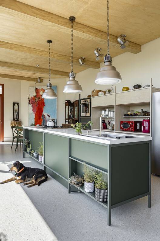厨房的工作台位于空间的中心,旨在为居民提供从花园到树梢和天际线的全景。这使得在准备饭菜时有了愉快的时刻。橱柜的设计高度低于天花板,营造出宽敞的感觉,而模块化设计则遵循主台面和对面书架的图案。