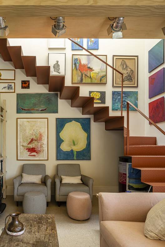 The living room emerges as an integrated yet protected space, with walls that interrupt the line of the frames, creating a more reserved environment, ideal for movie sessions. This solution also opens up space for a gallery specially organized to display the residents' personal collection, illuminated through the skylight that demarcates the perimeter of the staircase.