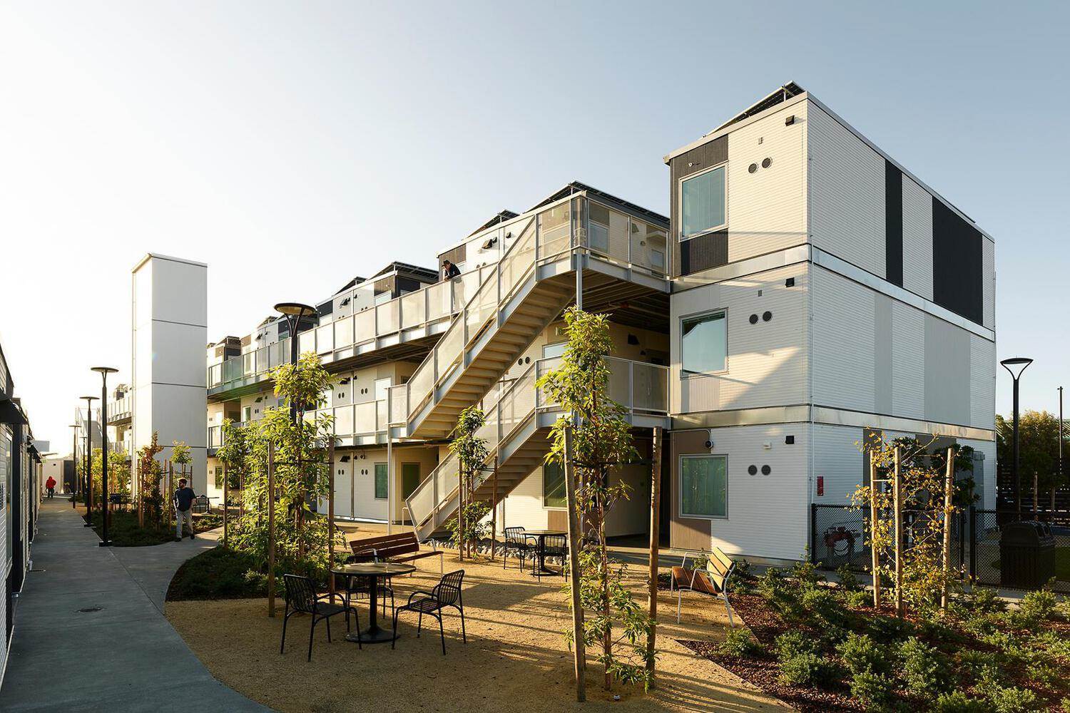 Clients need a secure space of their own, where they can store their belongings without fear of theft and where they can wake up in the morning to solitude and serenity. At the same time, clients are encouraged to spend time outside their rooms, interacting with each other and with case managers and other staff. A variety of outdoor spaces ranging in character from quiet and secluded to open and public are meant to provide enough options for any client to find a place where they can feel comfortable. Except for two larger structures for gathering spaces and communal dining, all buildings are composed of prefabricated modules. While these components were being built in a factory, grading, utility installation, and foundation construction prepared the 2.5-acre site to receive them. These efficiencies in schedule and construction allowed this facility to be built at a very economical cost of roughly $240k per door.