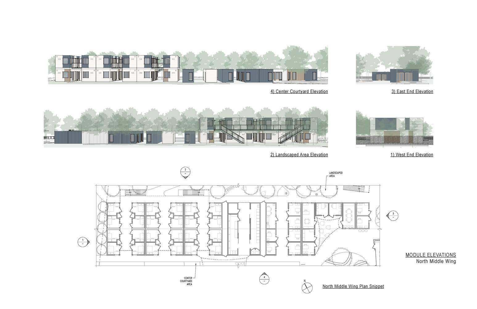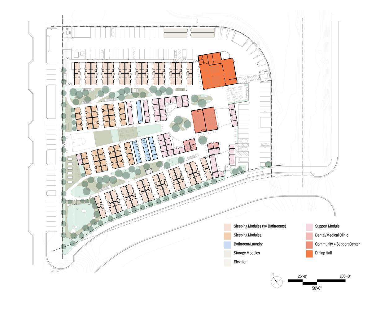 该导航中心一次为大约260名以前未使用过的客户提供服务,预计停留时间为3-6个月。该设施是居民从街头生活中恢复过来并成功过渡到稳定住房的避难所。考虑到这一目标,该网站旨在平衡隐私和社区。大多数卧室都有独立浴室;对于那些没有获得这种特权的客户来说,有一些无浴室的单元,可以在共享卫生间模块中使用单独的淋浴和厕所隔间。其他预制模块包括办公室和会议室,供支持人员和安保人员使用,客户物品和设施维护的存储,洗衣房和医疗诊所,以及员工休息室和卫生间。