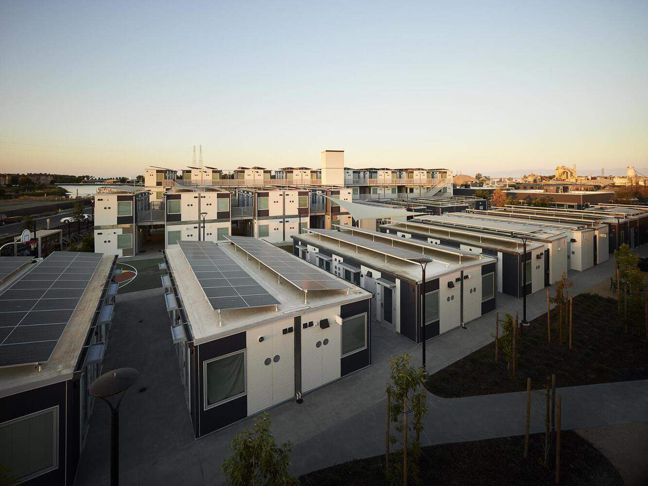 This navigation center serves roughly 260 formerly unhoused clients at a time, with anticipated stays of 3-6 months. The facility serves as a sanctuary for residents to recover from life on the street and successfully transition to stable housing. With this goal in mind, the site is designed to balance privacy and community. Most of the sleeping units have en-suite bathrooms; for those clients to whom that privilege is not extended, there are bathroom-less units with access to individual shower and toilet stalls in shared restroom modules. Other prefabricated modules house offices and meeting rooms for support staff and security, storage for client belongings and facilities maintenance, laundry rooms and medical clinics, and staff break and restrooms.