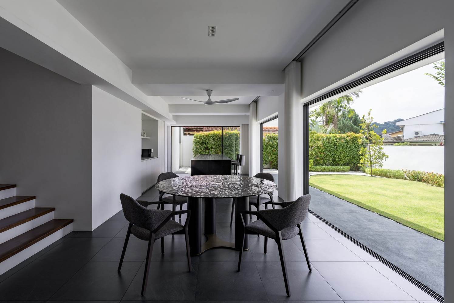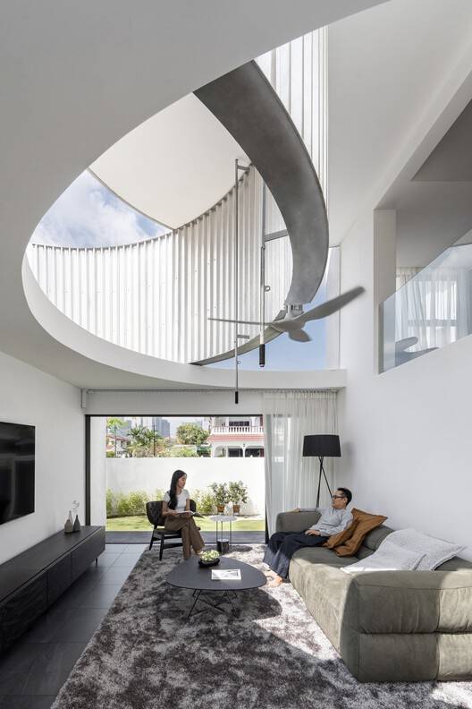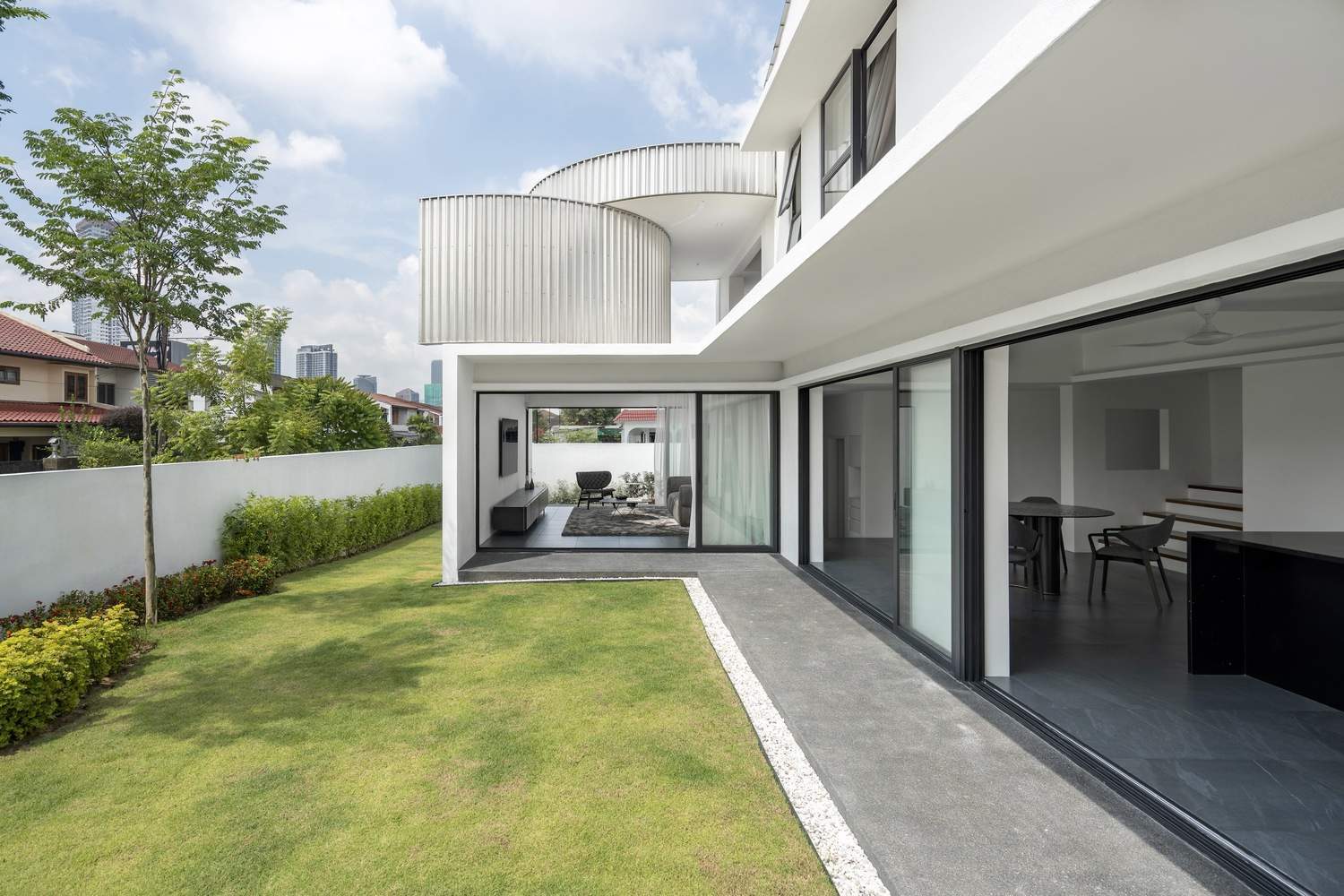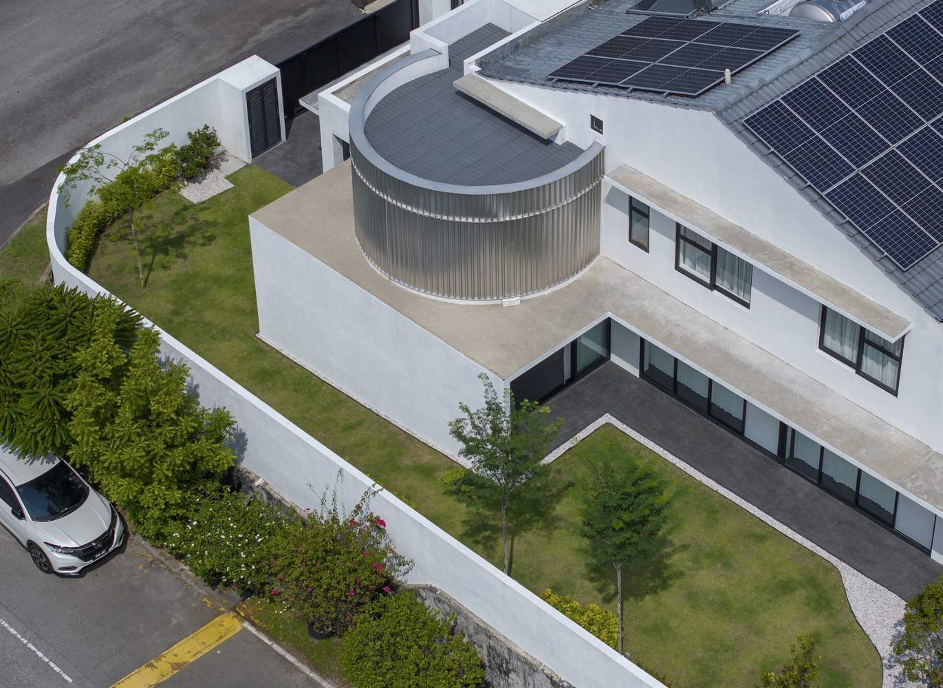 Text description provided by the architects. CC House is a spacious corner terrace home located in Bangsar, Kuala Lumpur, with a sloping rear garden and a distinctive split-level interior. The renovation retains much of the original structure while thoughtfully adapting it to meet the owner's new needs. The exterior is simple, featuring a clean white facade and high garden walls that curve around the corner. Above these walls, a matching curved metal facade hints at the design elements found inside.