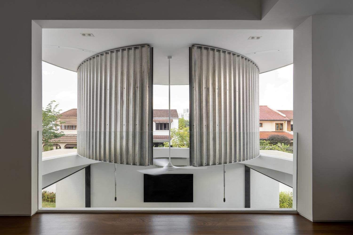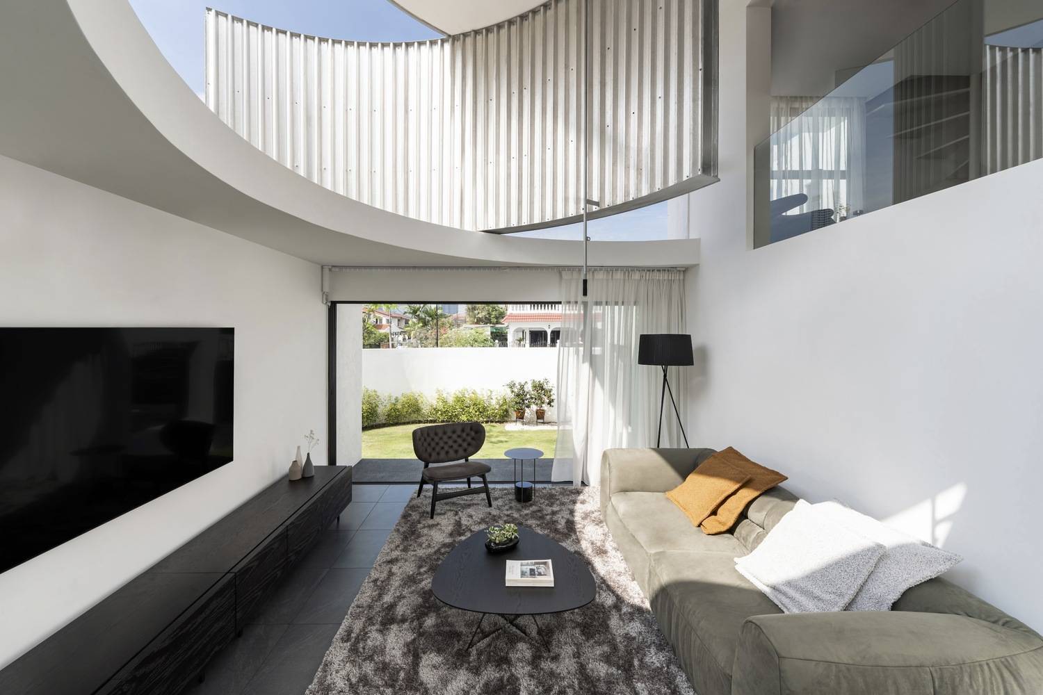 The living room extends to the side of the original house, forming a new double-volume space that becomes a room in the garden. This space serves as the main feature of the house, with a rectangular form on the ground floor that appears to float above the garden's slope. A semi-circular form on the first floor sits on top, visible from the road outside. The corrugated galvanized metal facade of this form has a heavy and imposing presence. It consists of two pivoting quarter-circle "moon doors" that conceal the structural columns. Every detail is carefully designed with precision, combining functional and innovative features.