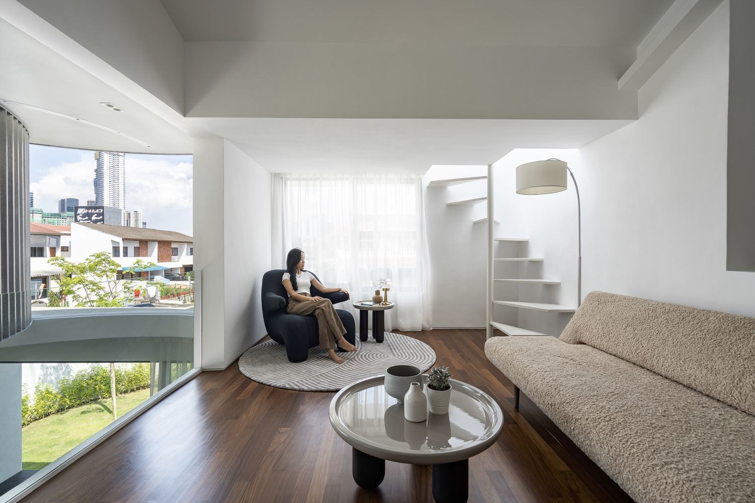 Three en-suite bedrooms are located on the first floor, each with views of the garden. A spiral staircase, tucked into the corner of the upper family room, leads up to a hatch. This opens to the rooftop above the semi-circular living room, offering sweeping panoramic views of the city.