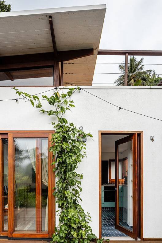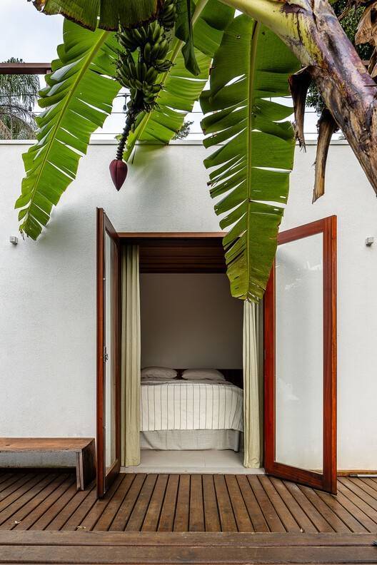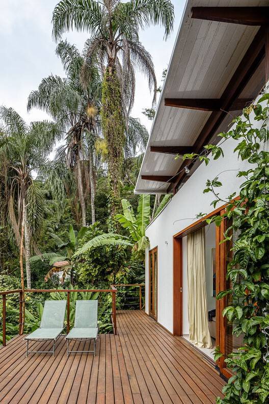 Text description provided by the architects. The uneven terrain and dense native vegetation of the Atlantic forest present unique challenges and opportunities for architectural design. To navigate the complexities of the site, a structural solution utilizing wooden tree pillars was selected, which not only provides stability but also creates a harmonious relationship with the surrounding environment. The existing old house on the property informed the design, with its masonry and foundations serving as the backbone of the current project.