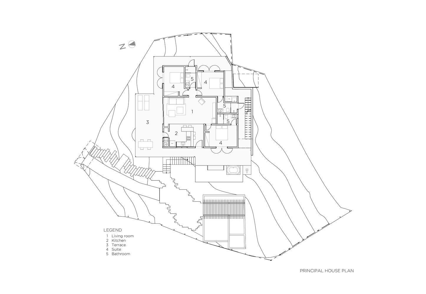 建筑师提供的文字描述大西洋森林的不平坦地形和茂密的原生植被为建筑设计带来了独特的挑战和机遇。为了应对场地的复杂性,选择了一种利用木制树柱的结构解决方案,这不仅提供了稳定性,还与周围环境建立了和谐的关系。该物业现有的旧房子为设计提供了信息,其砌体和基础是当前项目的支柱。