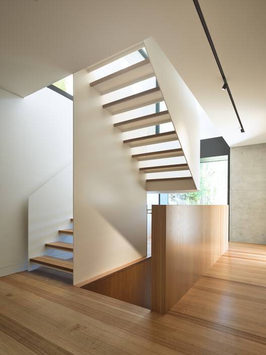 Drawing inspiration from the medieval corbel — a stepped architectural element projecting from walls to support weight — Nick Bell Architects used the age-old principle to meet the challenge of building on a narrow strip of land with a steep slope, difficult access, council height considerations and desire to maintain the ecology of the expansive waterfront site (1696 sqm).