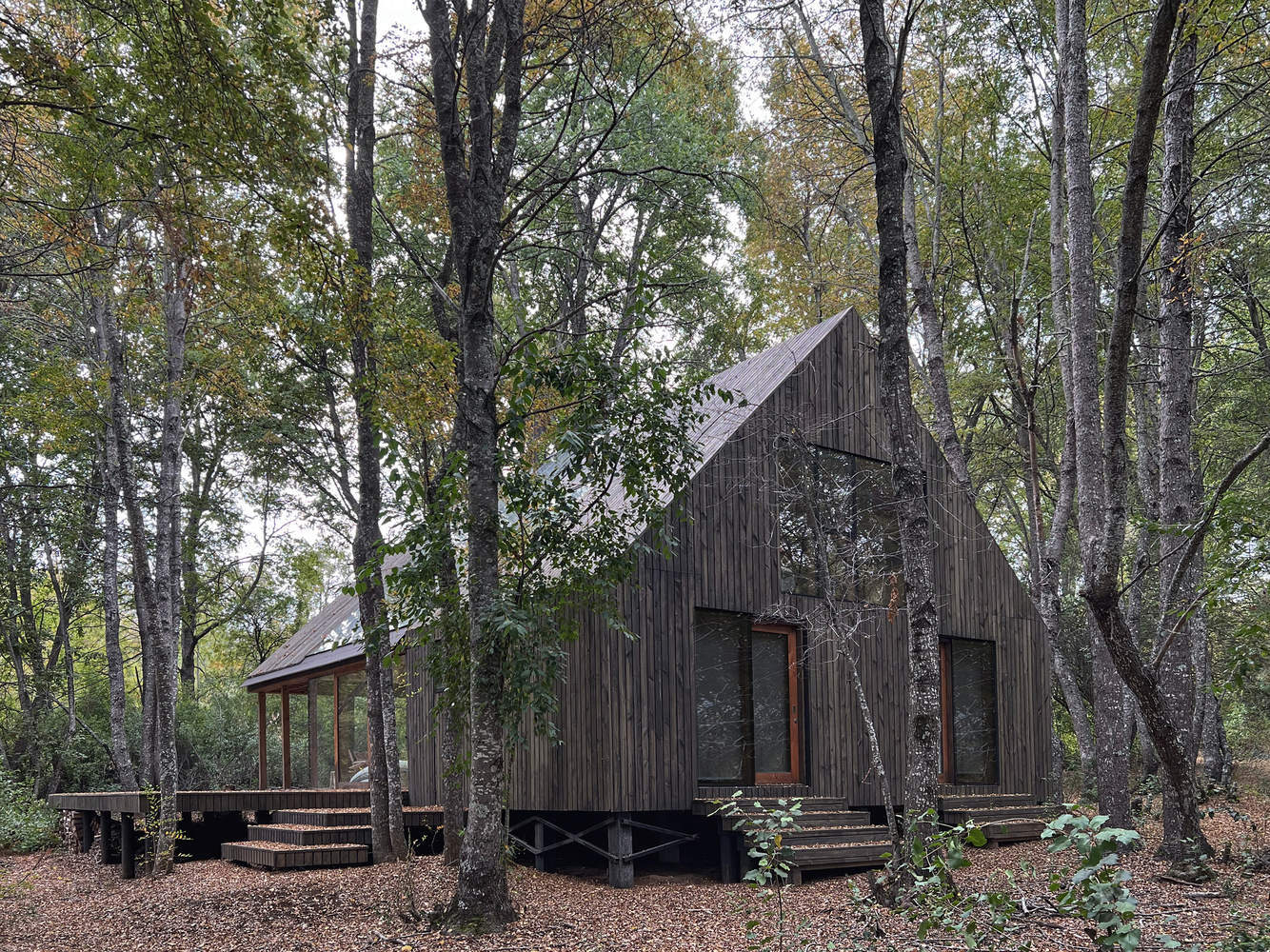 Being immersed in a deciduous forest, during the summer, the space is protected by the shade of the leaves, while as the cold winter approaches, it gradually receives sunlight inside with the falling of the leaves. The project thus proposes an interior space entirely linked to nature and the outdoors, through a fully glazed envelope, like an inverted greenhouse, where the plants are outside, and the people, inside, are enveloped by the landscape and the trees.