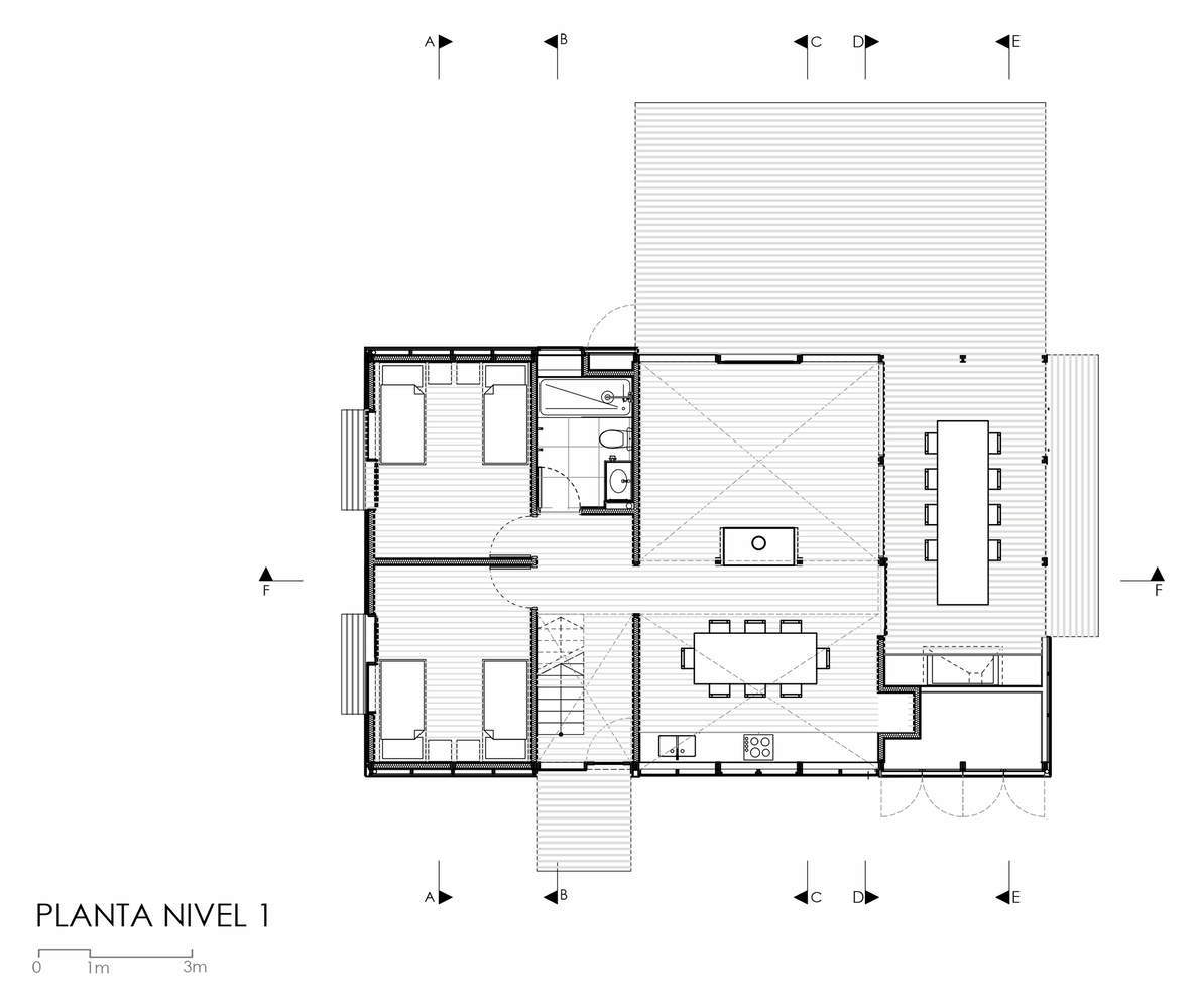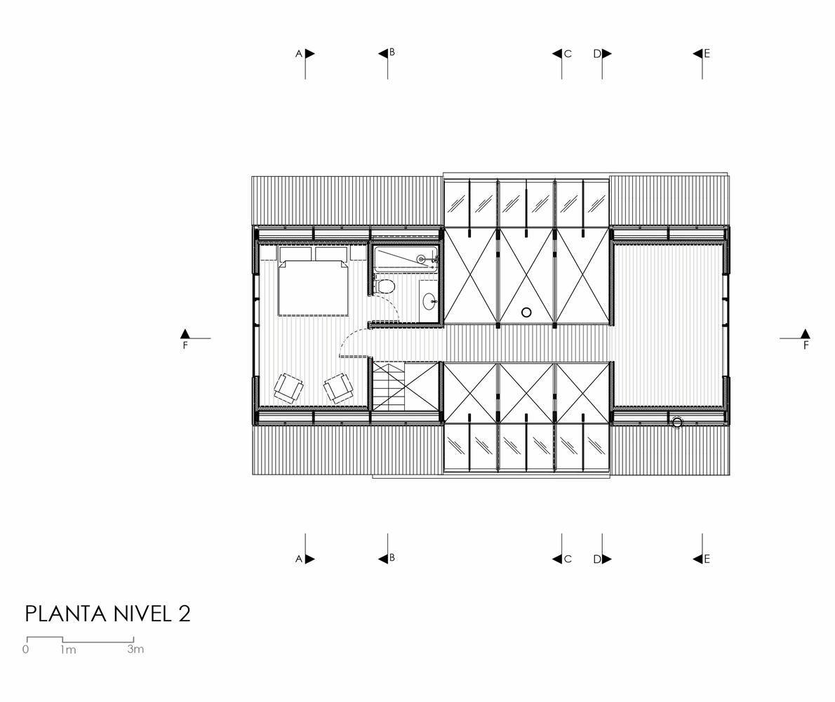 玻璃空间容纳了主要和更多的公共区域,如客厅、餐厅和厨房,而卧室的设计则更加封闭,以获得更大的亲密感。考虑到难以进入和位置偏远,该结构由木材制成,因为它是一个易于运输的快速施工系统。该计划在两层楼开发,旨在集中精力减少足迹,尽量减少对森林的影响。