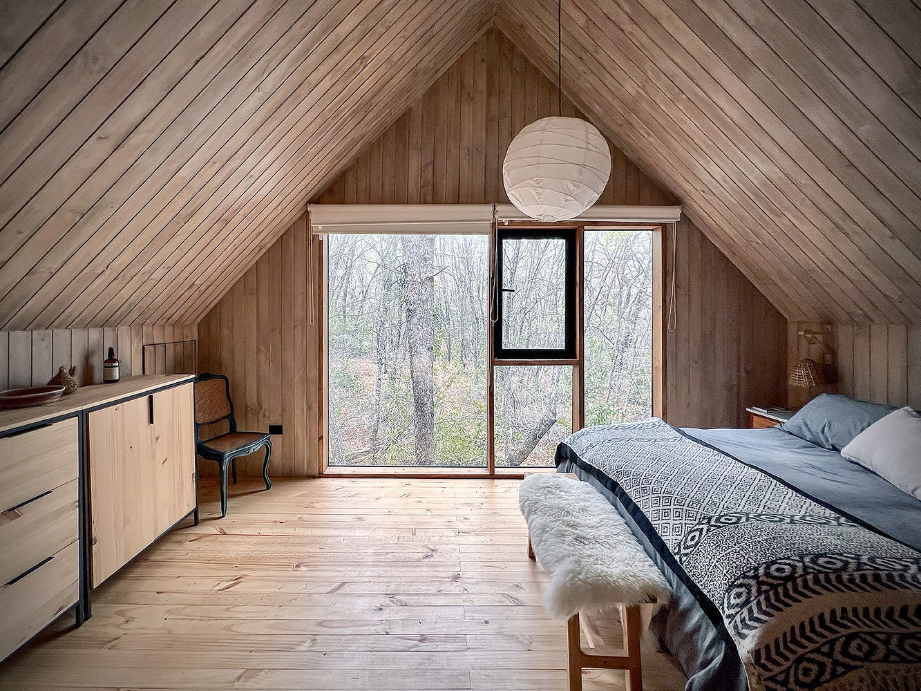 独特的自然融合设计:这个项目坐落于智利中南部安第斯山脉的橡树林中,海拔约 950 米。这里的温度不高且橡树落叶,景观不断变化。设计师抓住这些特点,打造了完全玻璃化的室内空间,如同倒置的温室,让人能垂直感受森林的真实规模,又无过热风险。夏天树叶阴影保护空间,冬天随树叶飘落阳光进入。玻璃空间容纳主要公共区域,卧室则更封闭以获亲密感。结构采用木材,便于运输和快速施工,减少对森林的影响。