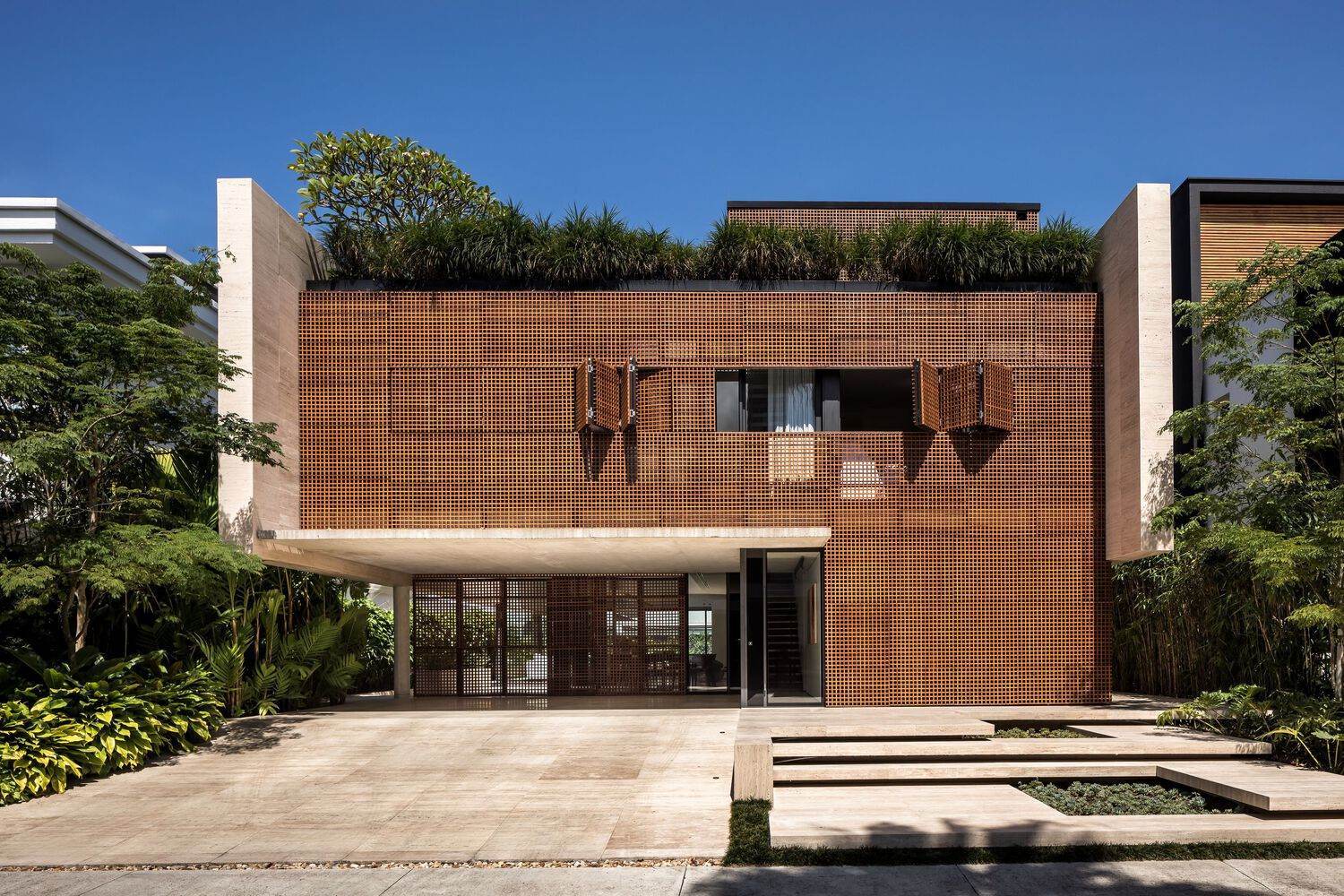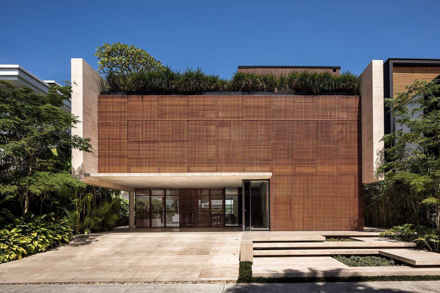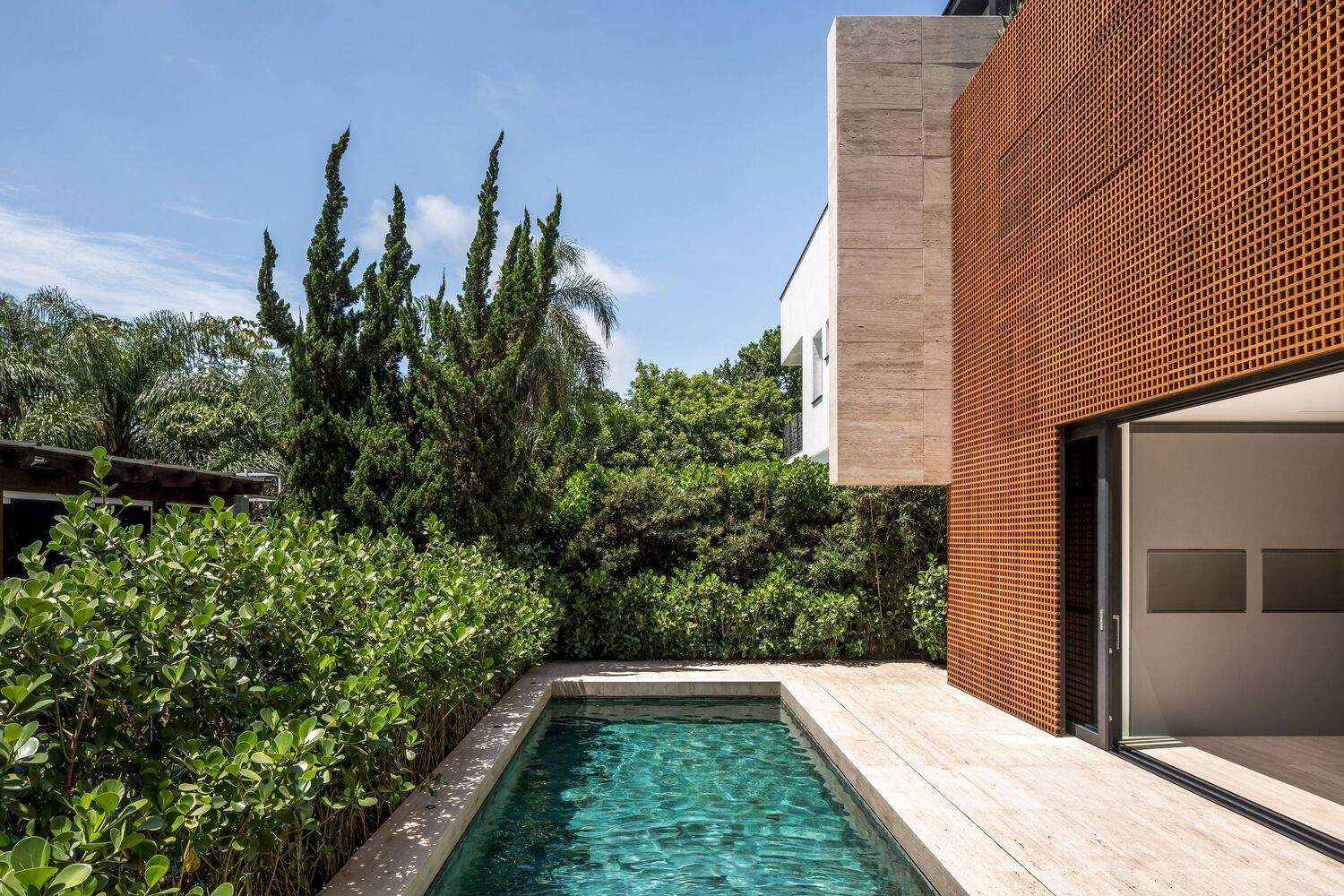 Text description provided by the architects. In a seaside condominium, the rectangular and flat lot of 520 sq m is surrounded by conventional two-story houses with attic. Countless windows and openings brought a big privacy issue for this 490 sq m residence. Therefore, the planned program was placed between two windowless and aerial walls, with travertine cladding, supported by columns, and positioned within the legal boundaries of the property. These aerial walls configure the side facades of the building, ensuring the privacy of the internal spaces from the nearest neighbors. The exception is the double-height ceiling that serves the daily dining room. On the opposite side, an open-air courtyard, also with double-height ceiling, protects the more glassed facades and illuminates the main areas of the house. The front and rear facades are enveloped by movable wooden mashrabiya to increase privacy and comfort in high temperatures.