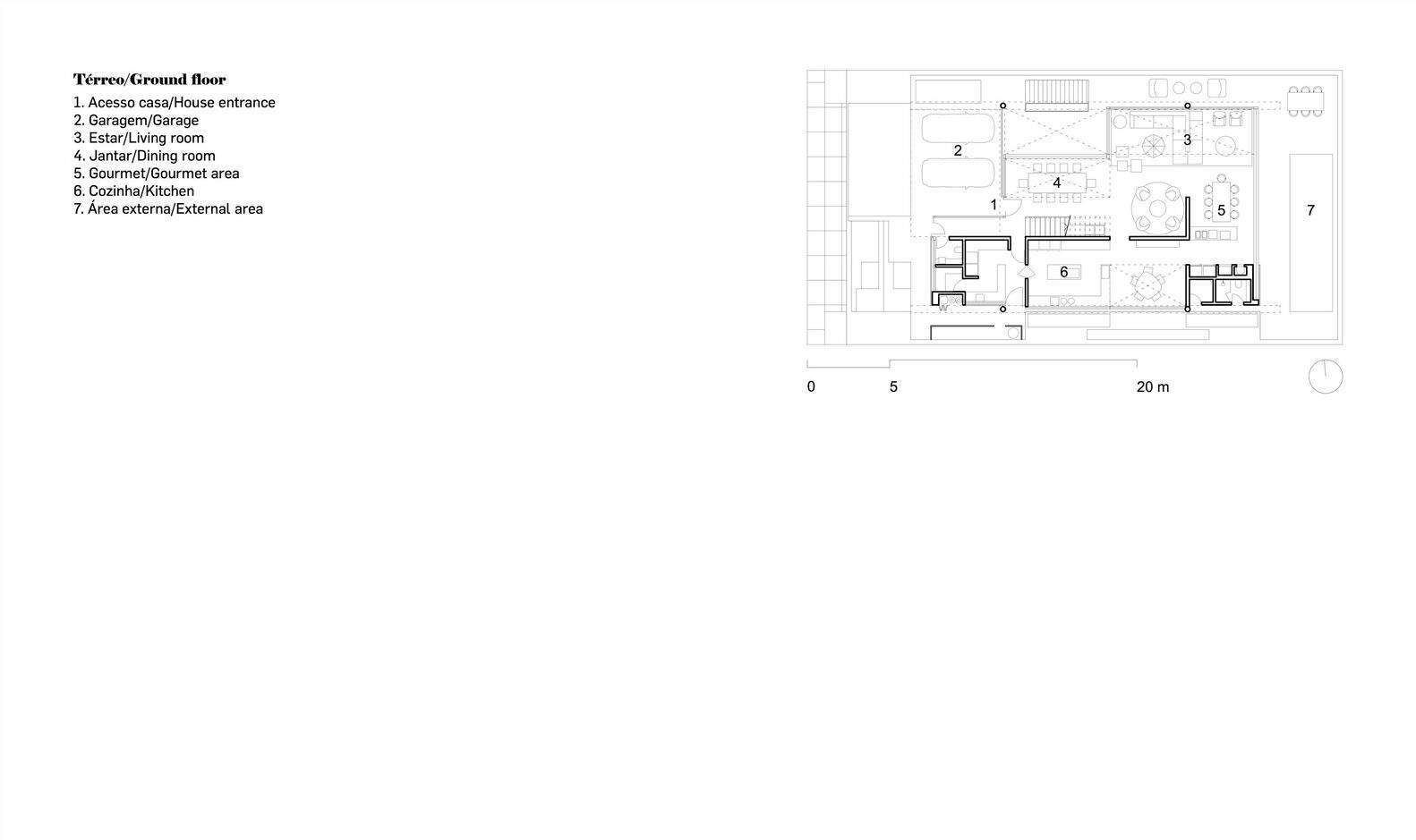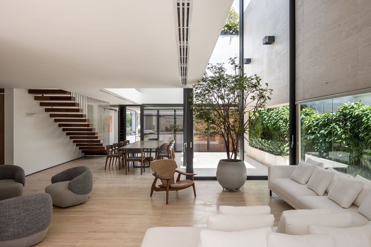 建筑师提供的文字描述在一栋海滨共管公寓里,520平方米的矩形平坦地块被带阁楼的传统两层房屋包围着。无数的窗户和开口给这座490平方米的住宅带来了很大的隐私问题。因此,计划中的方案被放置在两个无窗的空中墙壁之间,有洞石覆层,由柱子支撑,并位于房产的法定边界内。这些空中墙壁构成了建筑的侧立面,确保了内部空间的私密性,远离最近的邻居。唯一的例外是每日餐厅的双层天花板。在对面,一个露天庭院,也有双层高的天花板,保护着更多的玻璃幕墙,照亮了房子的主要区域。前后立面被可移动的木制mashrabiya包围,以增加高温下的隐私和舒适度。