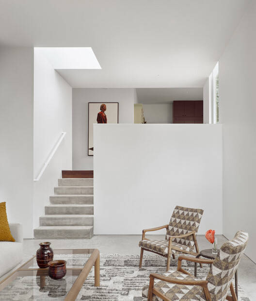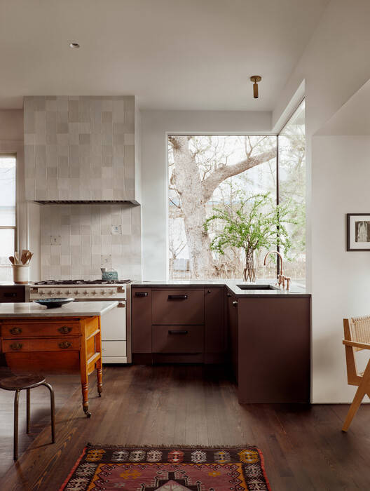 平面图被重组为更适合现代家庭需求的新配置,而现有的木制品、窗户和地板则得到了精心维护和翻新。在房子的后面,破旧的门廊结构被拆除,取而代之的是一个新的厨房和用餐角,作为历史悠久的房子和现代建筑之间的开放连接。从半层楼下来,提供高架天花板和大片玻璃,扩建后设有一间新的家庭房和主卧套房,可通往后院。