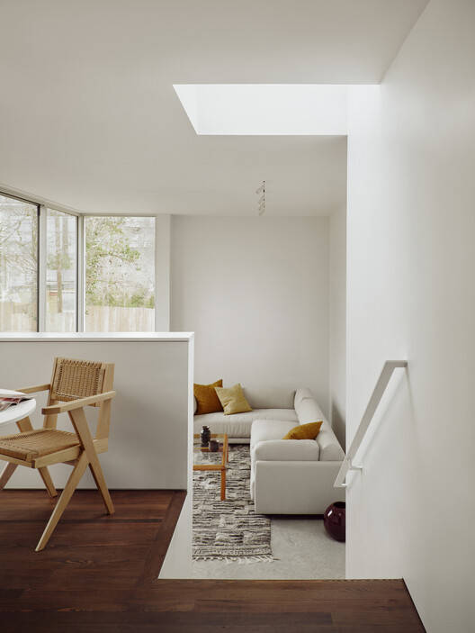在内部,通过一系列连续的空间,现有建筑的温暖历史特征逐渐向外部加建物的光线充足、基本细节的围护结构敞开。在这两个角色相遇的地方,新旧交织在一起,并通过厨房的玻璃侧入口和无框角窗的游戏来表达,这为客人提供了一个宽阔、光线斑驳的私人花园视野。
