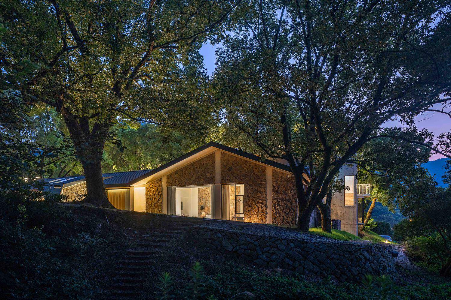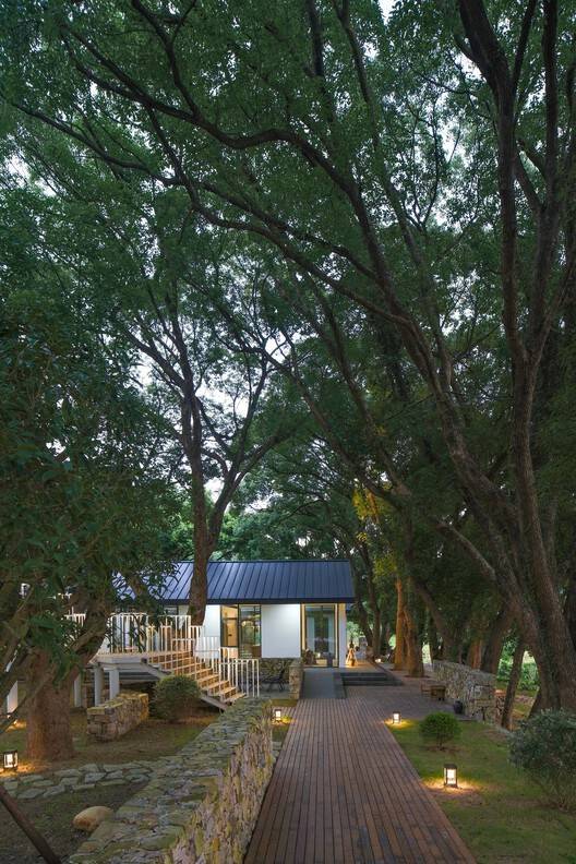 Text description provided by the architects. The Healing Hills Villa was originally a deserted courtyard atop a small hill, surrounded by lush green trees with twisting roots, making it feel as if it were protected by 48 old camphor trees. The transformation of the architectural space relies entirely on the relationship with the trees—neither encroaching upon them nor isolating them. There are three strategies. First, the scattered buildings were integrated into three courtyards, each relatively independent yet closely connected. Second, the boundaries between the built environment and the natural surroundings were blurred, allowing trees to coexist within the courtyards and the courtyards to extend into the trees, creating a seamless interaction between architecture and nature. Finally, new functions were infused based on the distinct characteristics of each space, creating a bridge of experience between the "artificial" and the "natural".