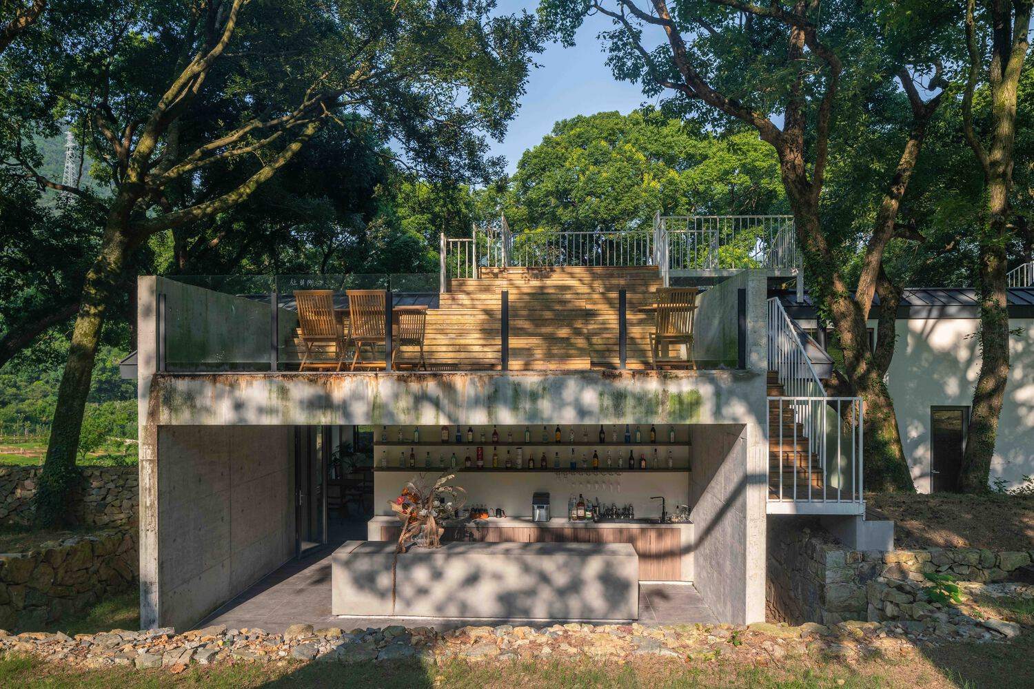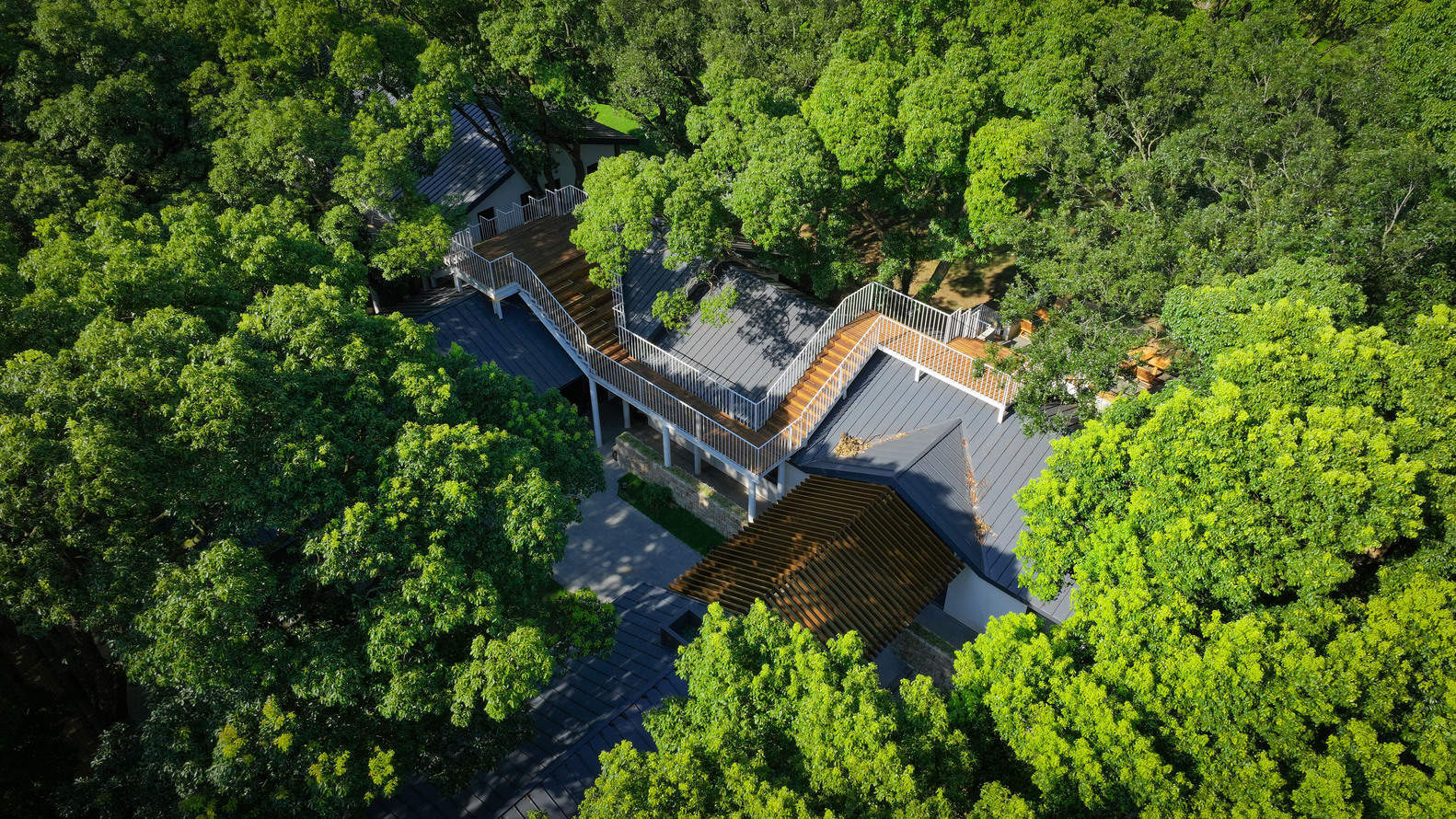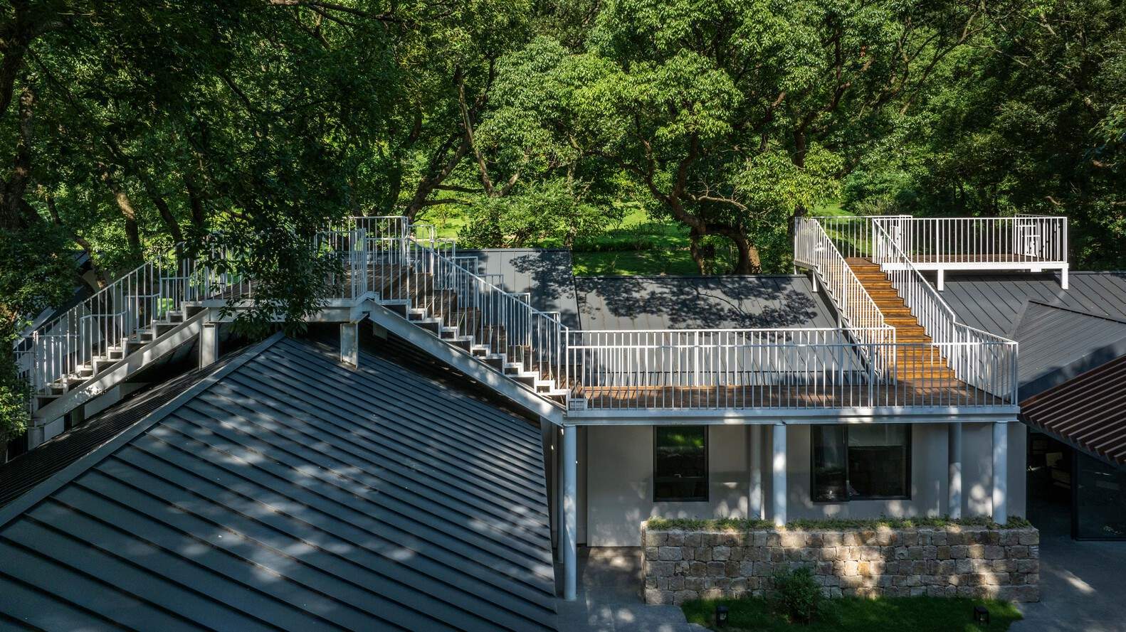 With the undulating terrain of the Healing Hill Villa site, the platforms are stacked at varying heights, "gazing" at each other between the trees, creating a landscape space and activity area that offers diverse spatial experiences.