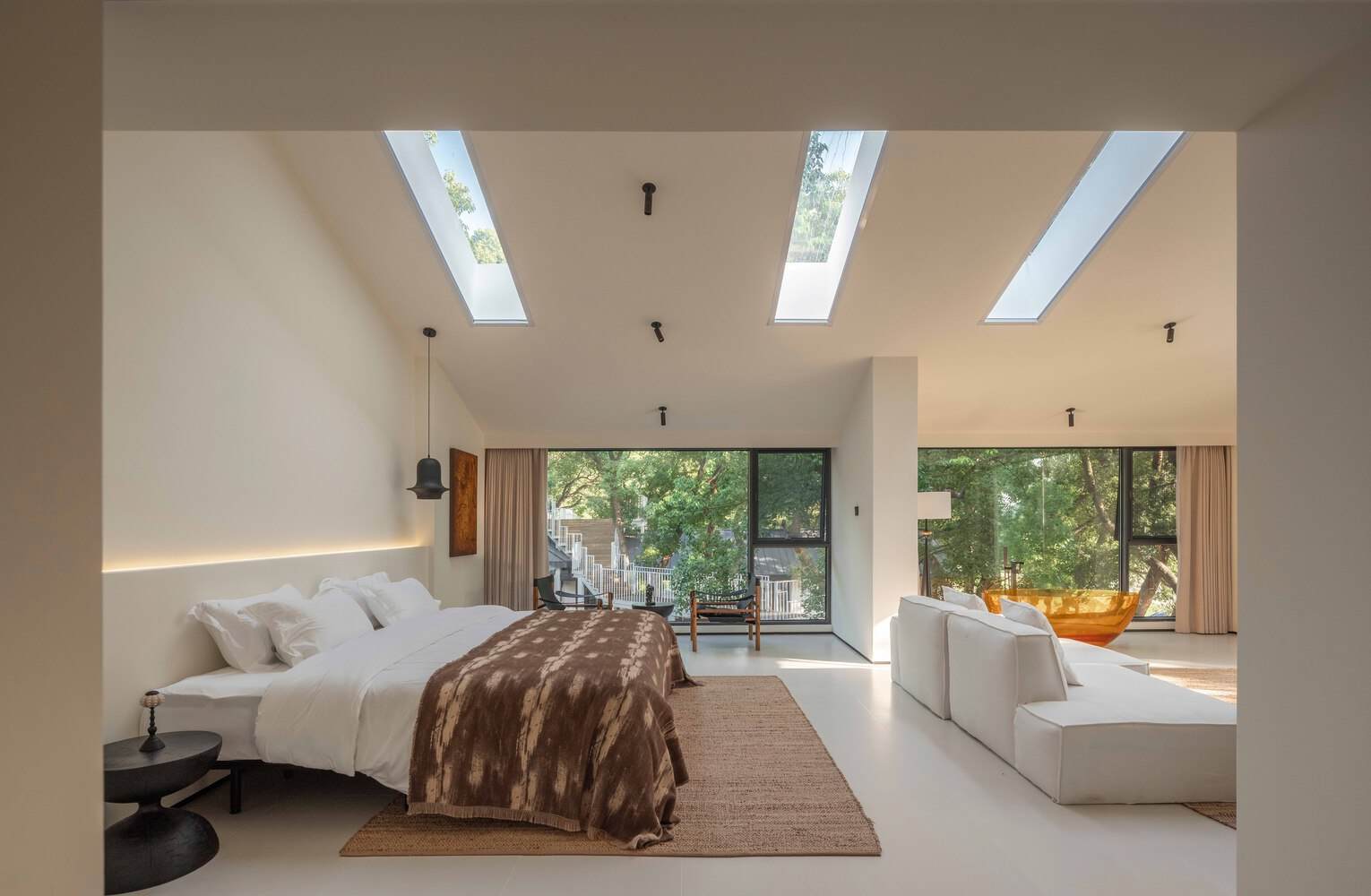 八间布局独特的客房享有独特的景致,室内装饰简化,使用“自然”来增强空间。这座桥连接着三个庭院,穿过建筑和树木,不仅是空间的连接器,也是人与建筑、人与自然之间的“桥梁”。疗愈山庄东西两侧设有暖心创作工作室和空心咖啡作为配套空间。