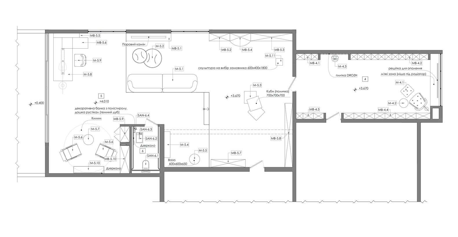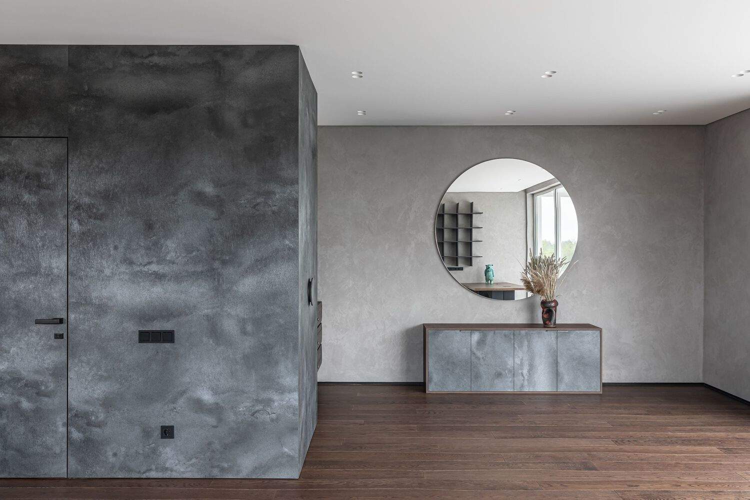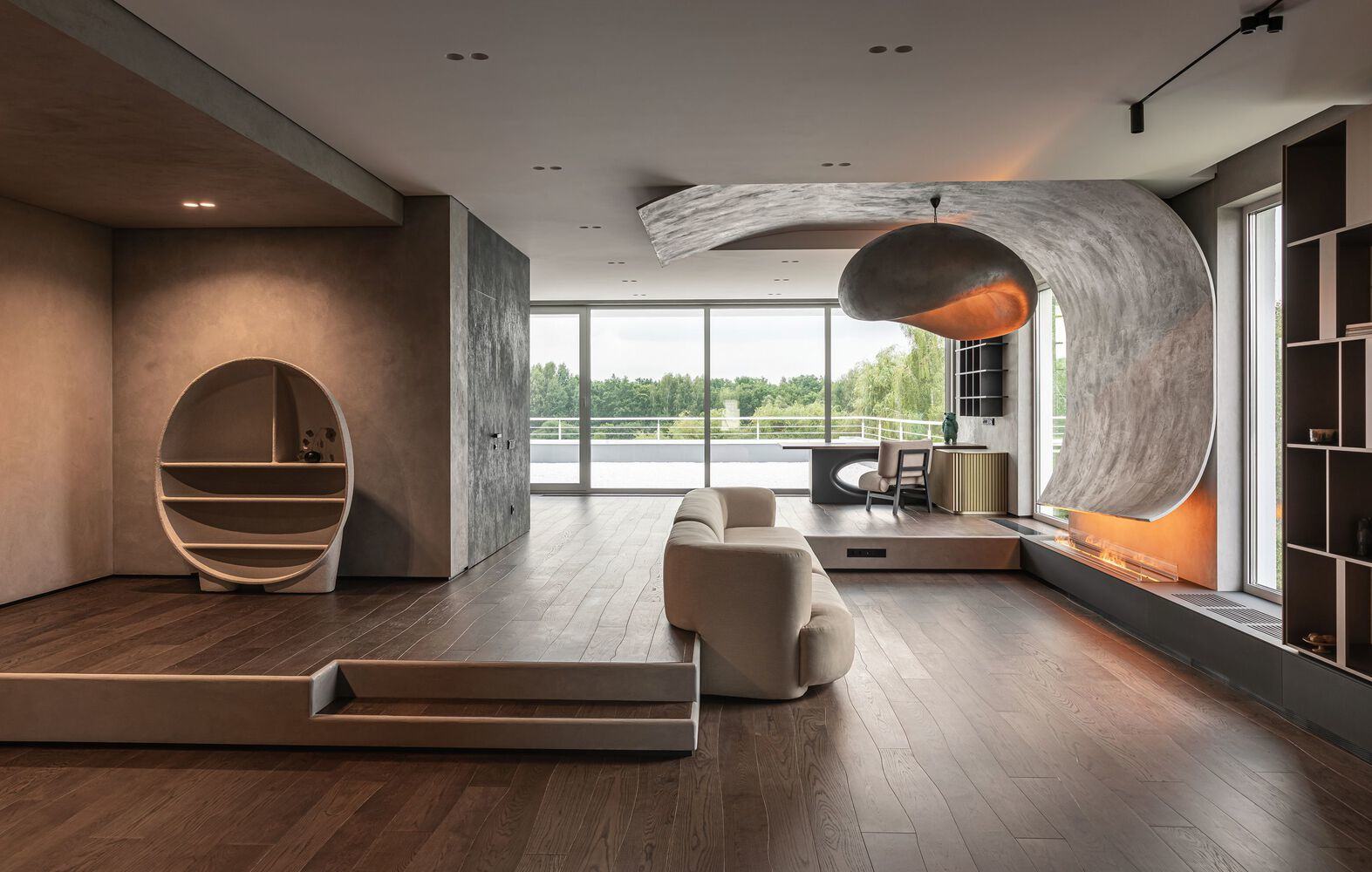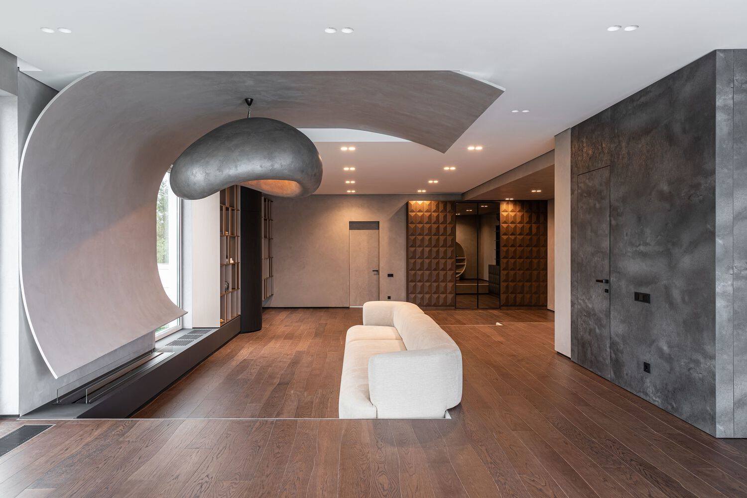 Then the huge room was expanded, and divided into several functional spaces. At the entrance, there is a shelf and a wardrobe for collection items of the master. A comfortable sofa near the central fireplace serves as a zone of rest over which is hanging the customized clay Khmara lamp in a grey color. In the center is located a unique architectural structure made of stone plaster. As if the frigate's wind is hanging a stone cloth around the room and warming the comfort of the fireplace's flame dances. "It may seem that the design is refined in the air, but the process of implementation was extremely difficult. The premise could preserve its function without "a wind", but the efforts made fully justified itself visually, giving the room the necessary accents of freedom."