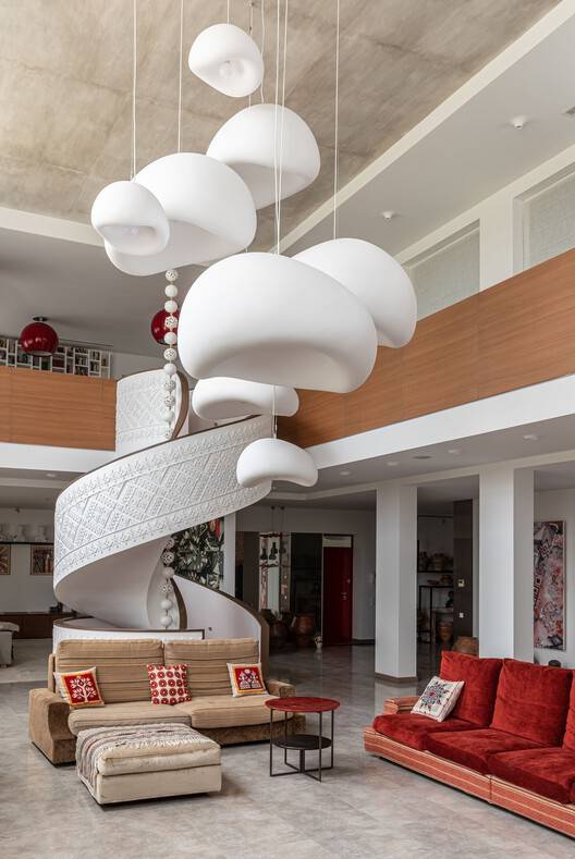 Text description provided by the architects. The Ukrainian authenticity encoded with the contemporary design and architecture — frequent requests from our clients. We believe that respect for the past is the guarantee of a conscious future. The MAKHNO Studio shares this philosophy, so in the Vyshyto house we tried to reveal the Ukrainian ethnicity once again. Maintain a balance between national self-perfection and modern visual solutions. Create our own unique ornament. In this house intertwined the significance of MAKHNO Studio's contemporary Ukrainian style, the past and the present, and what is very important – the energy of clients, like the ornament on the central case, that repeats throughout the whole house, and the hanging iconic Khmara lamps create the illusion of a sky-like atmosphere. Vyshyto is a home for a large Ukrainian family with a father, mother and four children. The family cherishes the national heritage, so they wanted to see it firmly woven into the DNA of their future home. This becomes clear when first acquainted with the house.