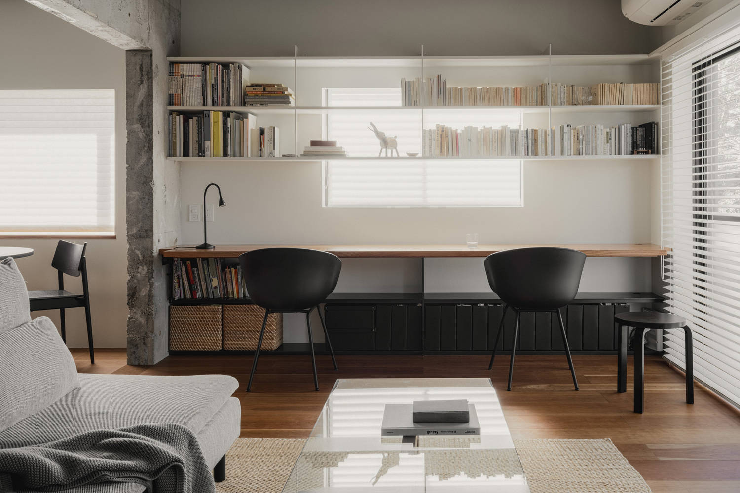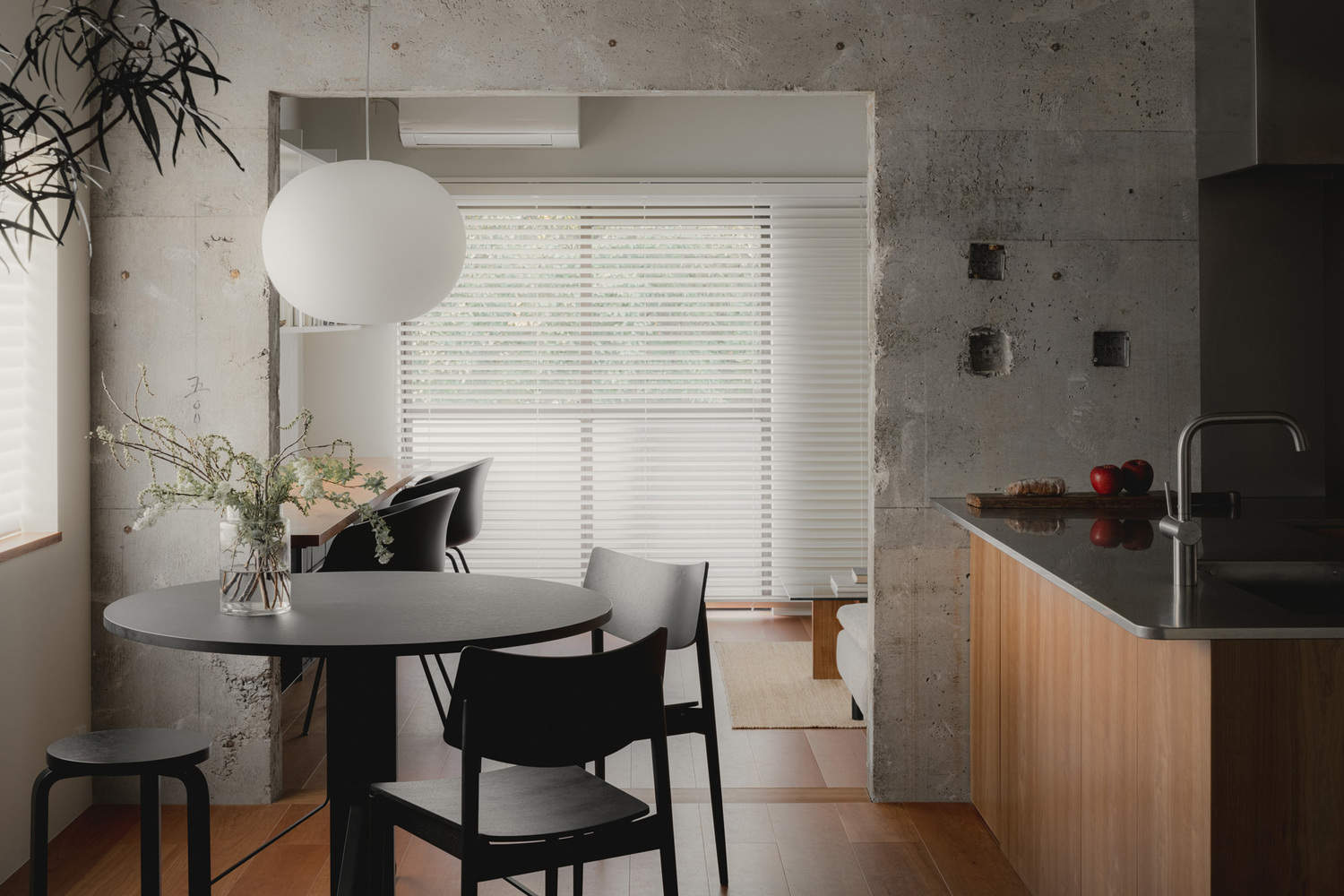 Refining the old concrete structure - This building is a 50-year-old concrete structure. We removed all the old finishing materials, exposing the concrete framework. In this project, we aimed for an interior design where the contrast and juxtaposition of the concrete structure and new materials beautifully blend together.