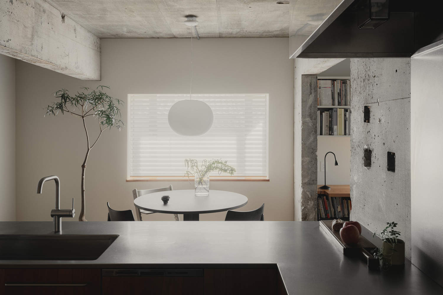 Contrast and juxtaposition - In the selection of materials, cherry wood, with its fine grain and pleasant texture, is used as the main material, with the intention of creating a contrast with the rough concrete frame that was made 50 years ago. Also, in correspondence with the zelkova forest visible through the windows, we used zelkova wood for the long desk and coffee table. The zelkova wood used for the coffee tables was recycled from old materials to create the design. A large mirror is placed on the wall behind the kitchen to minimize its presence, visually enhance depth, and serve as a device to bring the outdoor greenery into the interior of the house.
