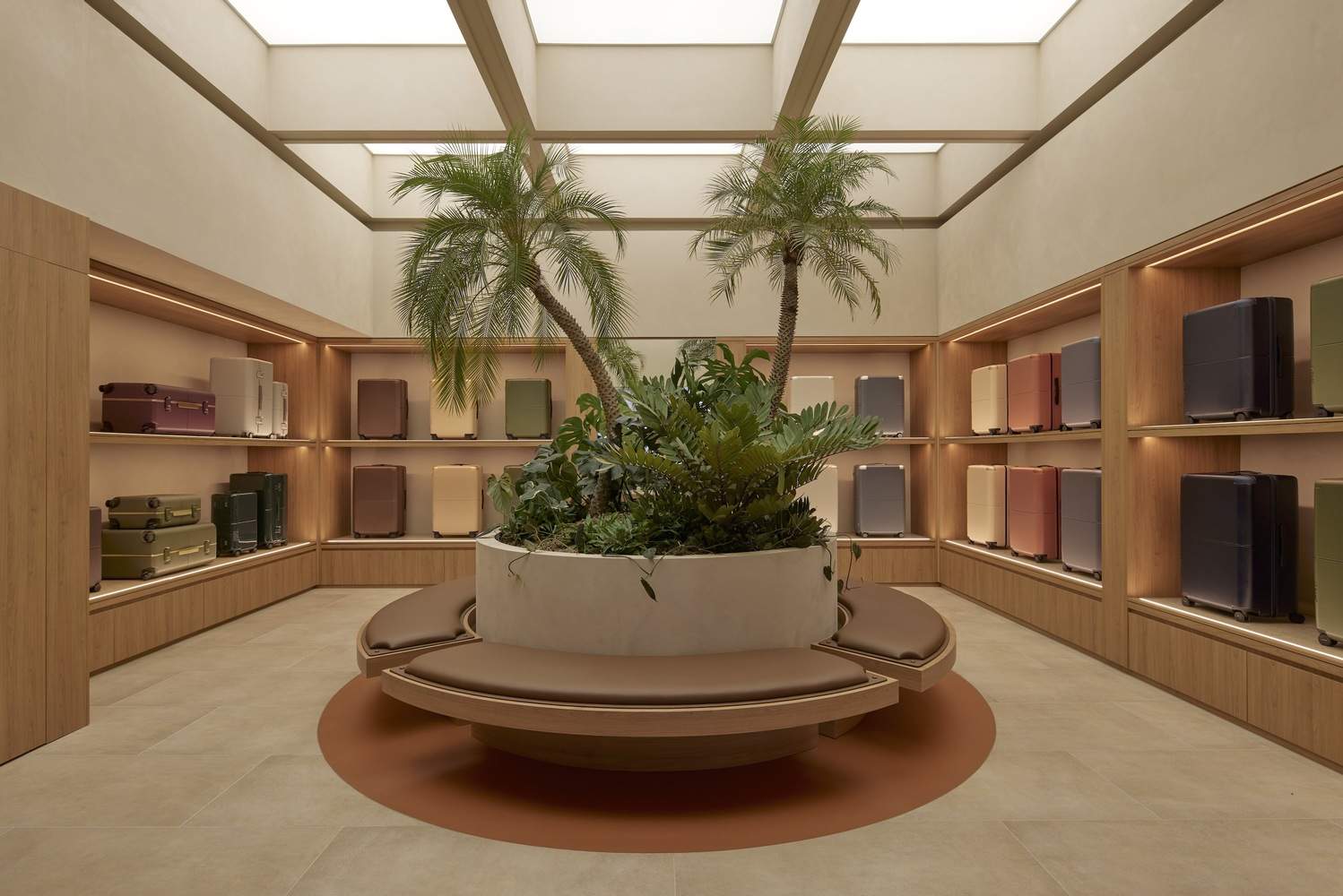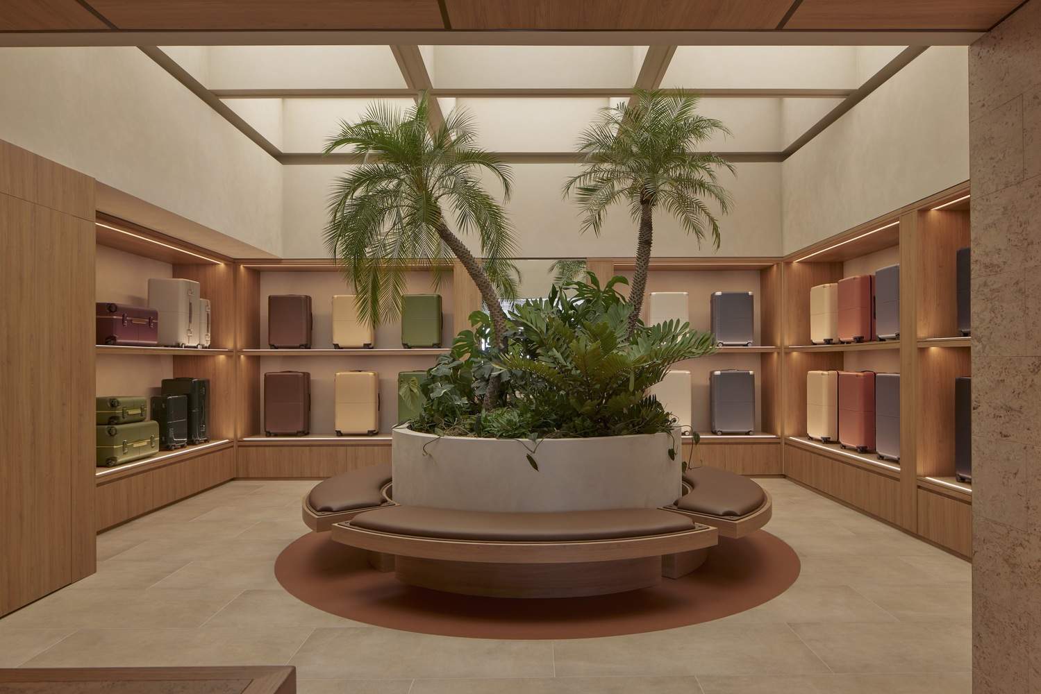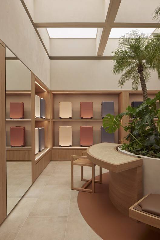 A dramatic volume change entices the customer to explore the depths of the store, with tactile surfaces beaconing them to touch and interact with July's quality luggage and accessories. Circular seating offers a moment of shopping respite to take in the surroundings, enlivened by tropical landscaping designed by Acre – a welcome delight and extension of the lush planting that the precinct is known for.