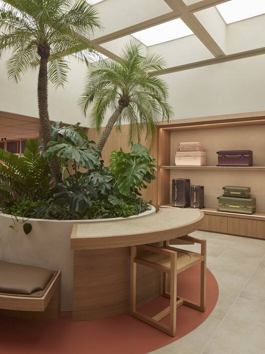 巨大的体积变化诱使顾客探索商店的深处,触觉表面引导他们触摸并与七月的优质行李和配饰互动。圆形座椅提供了一个购物休息的时刻,可以在周围环境中放松身心,由Acre设计的热带景观使其变得生动起来——这是一种受欢迎的乐趣,也是该地区以郁郁葱葱的植物而闻名的延伸。