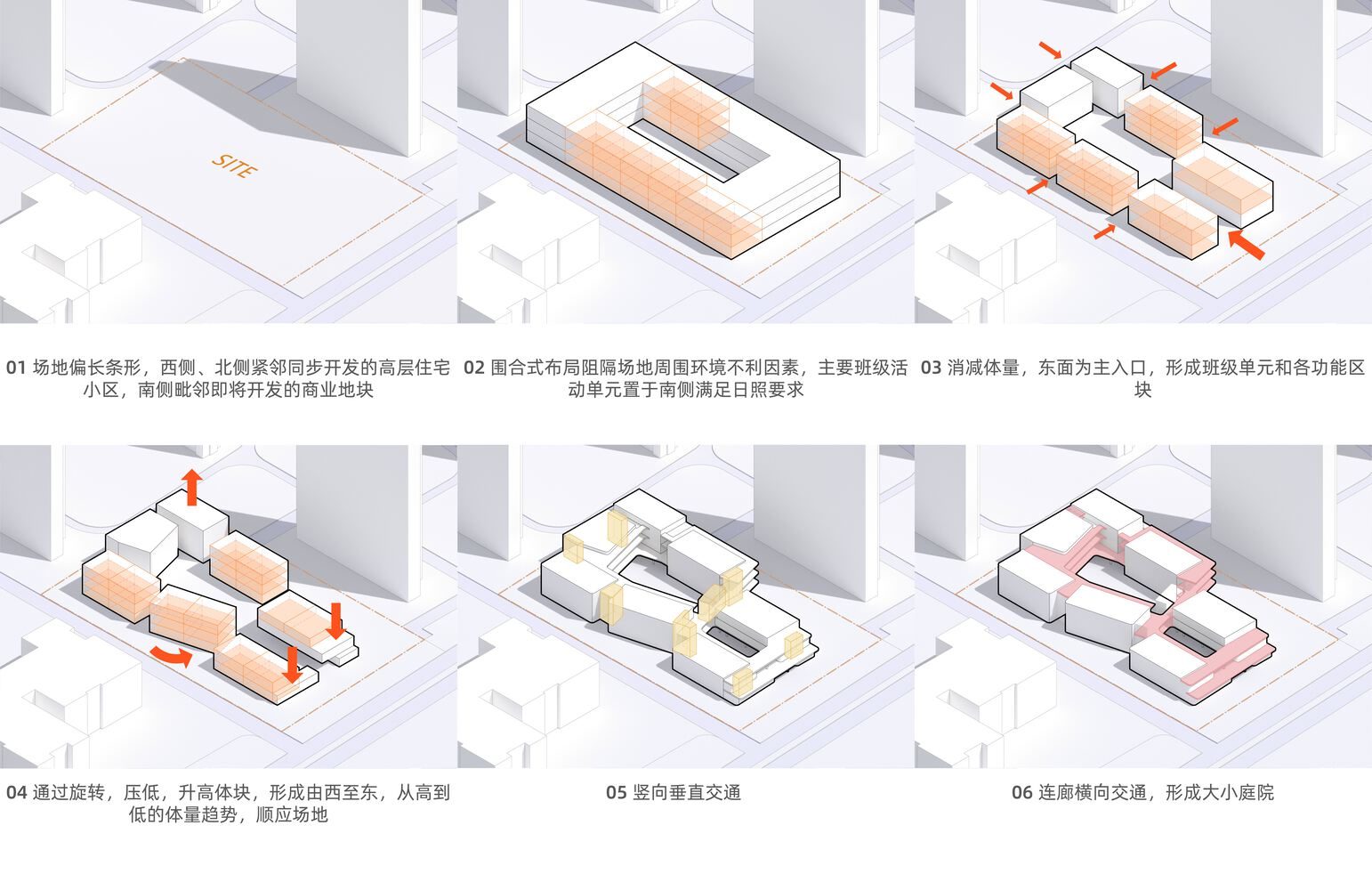 “云”群呈南北走向,南低北高,东低西高。这种设计最大限度地利用了自然光,同时允许游客在接近主入口时辨别建筑的整体效果。作为幼儿园的主要空间,教室活动单元位于南部和北部建筑群的南侧,确保了充足的自然光。物流和服务室位于靠近物流停车区的街区。行政办公室位于主入口附近,西北部最高的街区。专业教室,如多功能厅、阅览室和音乐室,分散在建筑的转折点。
