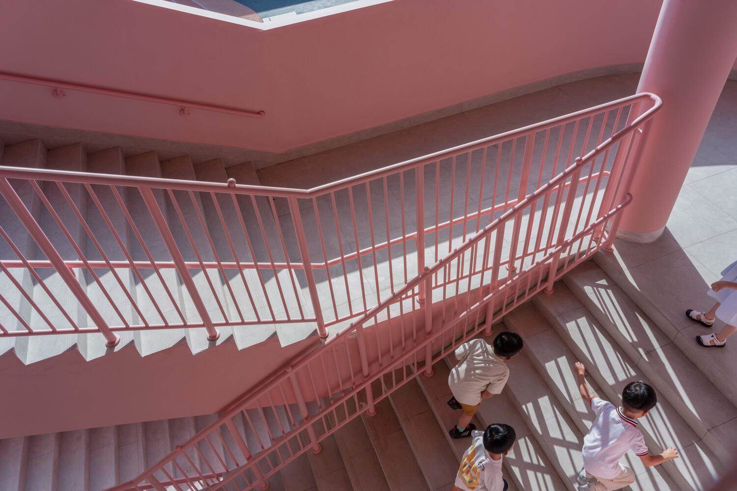 Designed with a "cloud" theme, we have created several outdoor activity courtyards of varying shapes and sizes. Each classroom, whether on the ground floor or upper levels, connects to its corresponding outdoor area, including courtyards on the ground level and connecting corridors on the second floor. The hyperbolic roof mimics the shape of clouds, and the all-white façade of the building harmonizes with the vibrant and playful rainbow pathways. The design carefully considers spatial scale and color usage, aiming to create a comfortable and dynamic environment for children at this stage of growth. The dreamy pink staircase not only meets fire safety and evacuation code but also becomes a part of the children's imaginative world and memories, inspiring their creativity and desire for exploration.