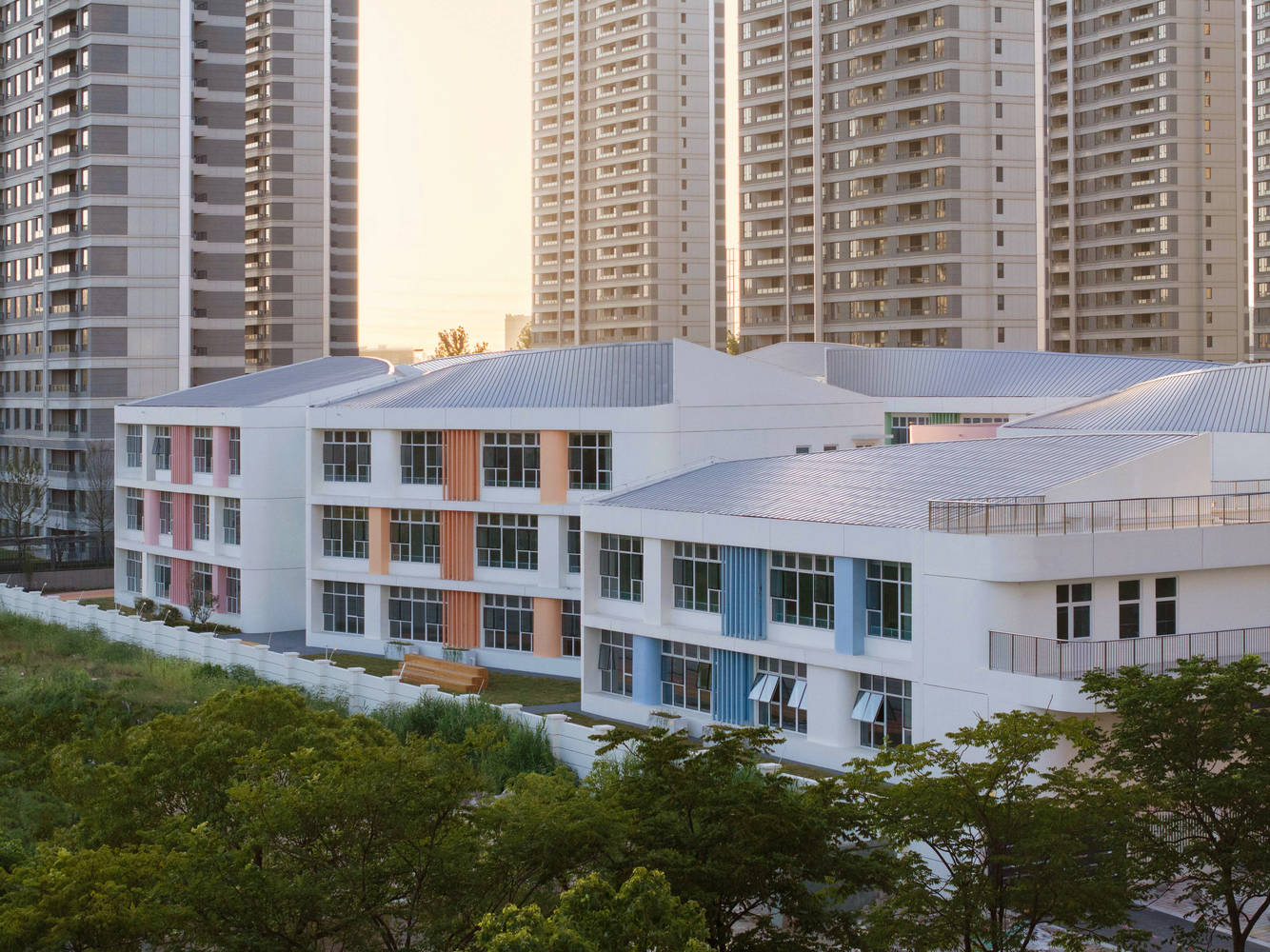 The building is designed as a series of "cloud" shapes that enclose a unique " Sky Castle" just for children. This enclosed design alleviates the oppressive feeling imposed by the surrounding high-rise residential developments and also shields the kindergarten from potential future disruptions from the commercial plot to the south that has yet to be developed.