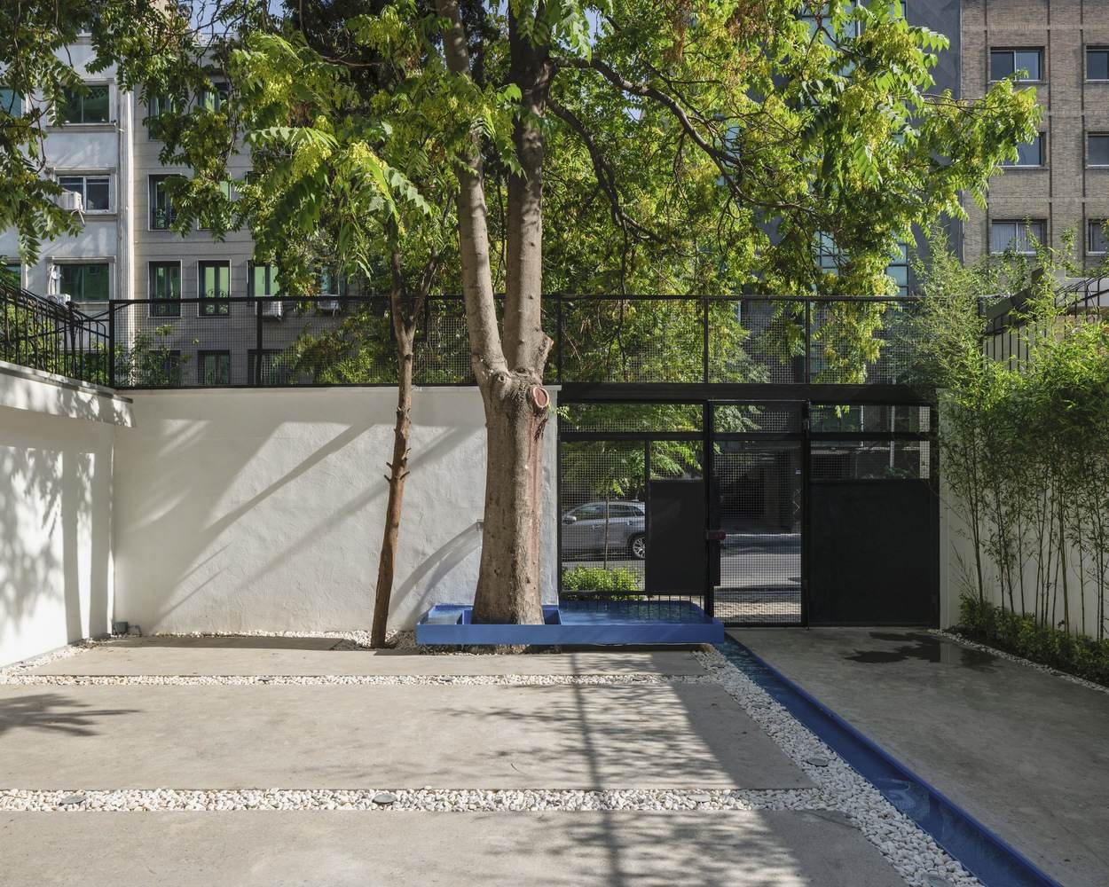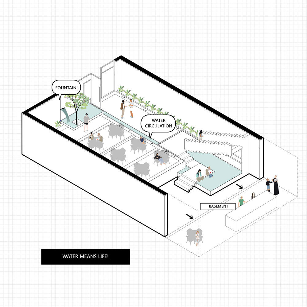 The sculptural staircase of the courtyard connects the basement, courtyard, and the first floor directly so that dining spaces are now connected. Since the existence of every creature is connected to water and the presence of water brings joy for the guests, we injected the essence of life into the complex to help it revive by the water flow. The sound of water also helps the building live.