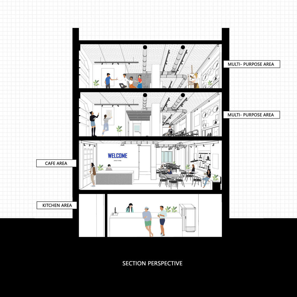 这座建筑必须适应新的生活,以便将较低的两层改造成咖啡馆餐厅和新一代人度过时光的空间。那具尸体复活了,准备为新一代服务。工业厨房也放在地下室,准备为上层服务。为了创造视觉多样性,我们添加了一些颜色,并试图与开放空间和庭院建立显著的物理和视觉联系。建筑必须生存和维护;因此,在楼上,我们考虑了一个灵活的聚会和活动空间,这样每天都可以讲一个新的故事;动态和生动的叙事;以及非重复的生命序列。