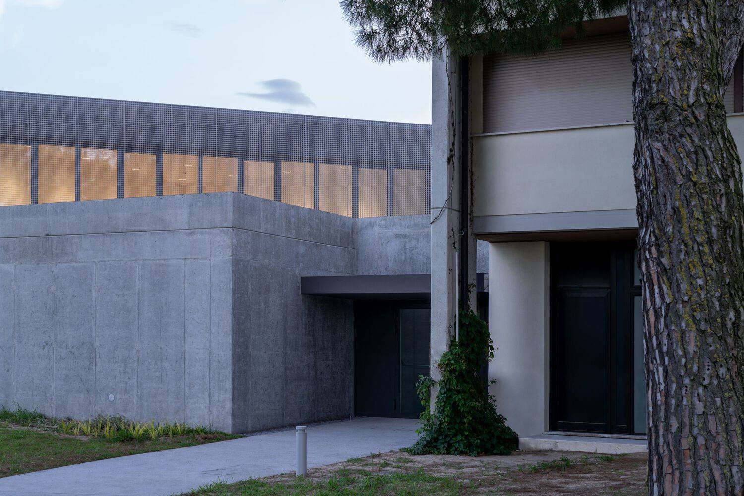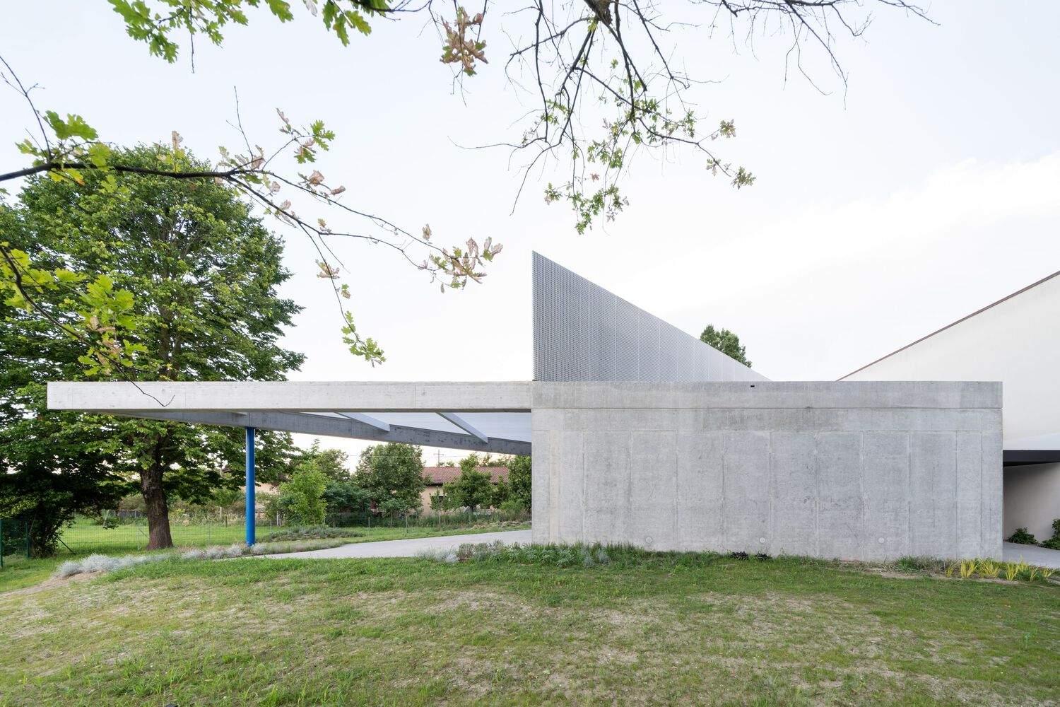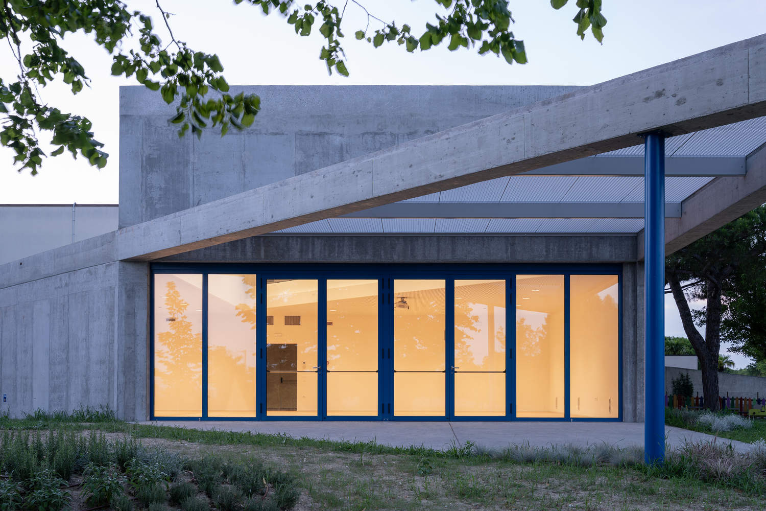 Connected to the existing building via a passageway that serves as the new entrance for the nursery, the pavilion is designed for independent use even during extracurricular activities. Constructed with exposed reinforced concrete, it houses a multipurpose hall of 120 square meters with an interior height ranging from 3 to 5 meters, which creates a sense of openness and brightness.
